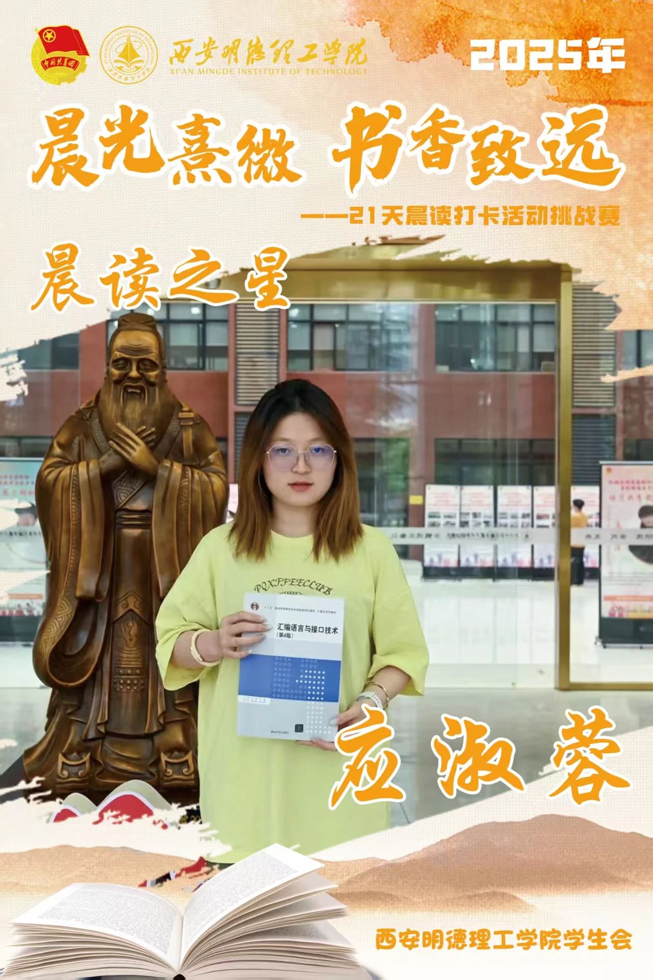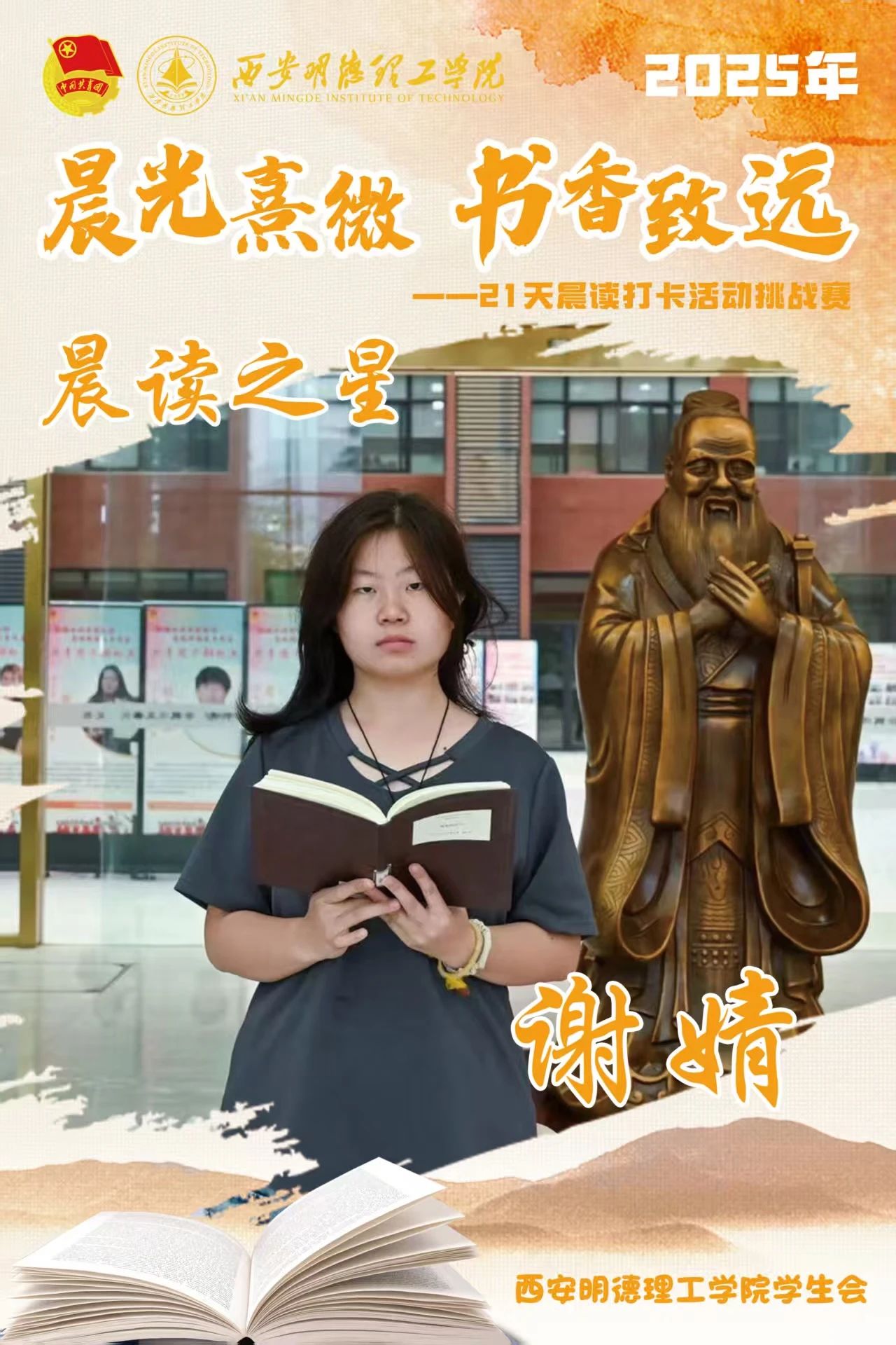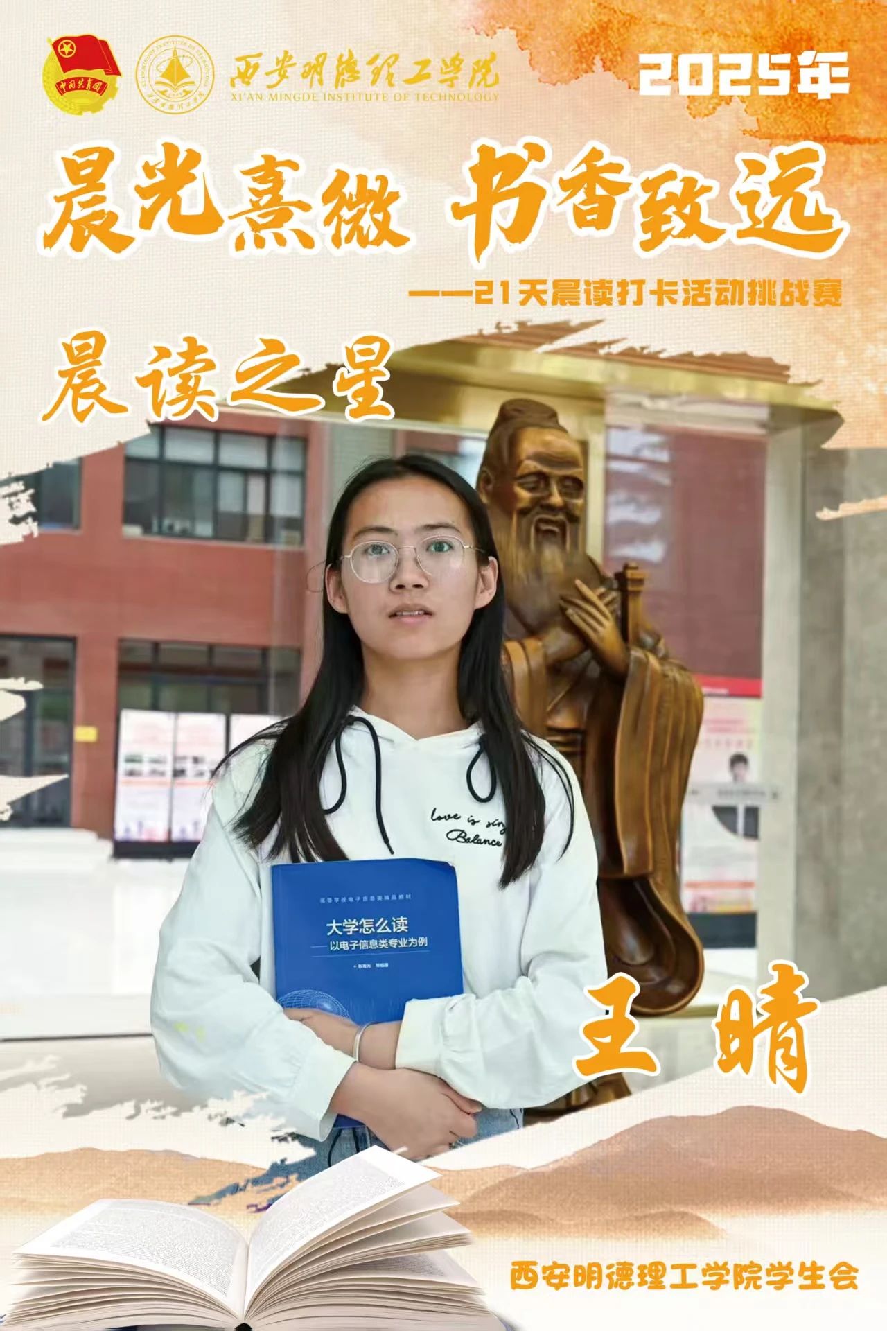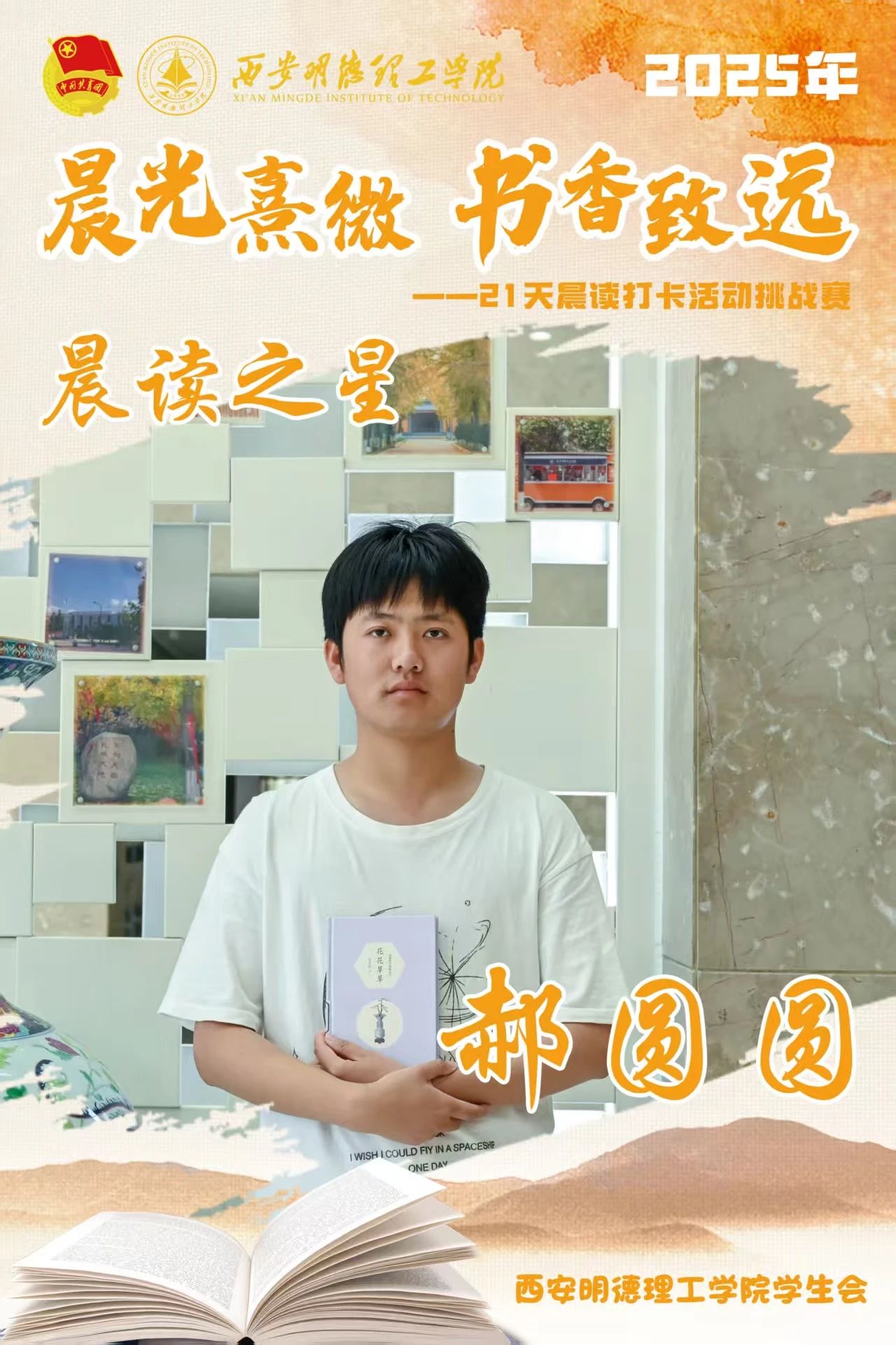 回顾21天的坚守,自律成为青春底色,每天清晨,下沉广场准时迎来晨读身影。有人捧着《论语》《诗经》,在古典诗词中感受文化底蕴;有人专注于英语四六级真题朗读,让标准发音唤醒清晨;更有同学带着专业教材,用公式推导与概念诵读开启学术思考。从春日微寒到柳絮纷飞,从初时的困意朦胧到后来的精神抖擞,同学们用行动诠释着“坚持”的力量。
