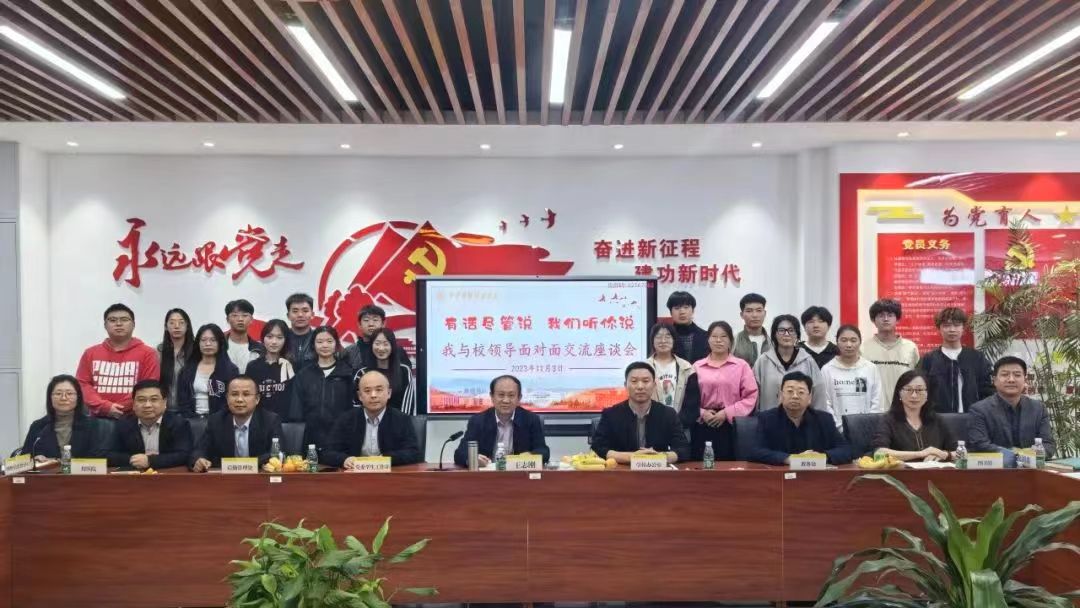 为进一步提升学校管理育人、服务育人的针对性与实效性,增强广大学生参与学校民主管理的主人翁意识,架起学校与学生常态化的沟通桥梁,倾听学生心声,解决学生问题,服务学生发展,11月3日下午,学校在明志楼北108会议室召开“有话尽管说,我们听你说——我与校领导面对面”学生座谈会。校长王志刚出席座谈会,学校办公室、党委学生工作部、教务处、后勤管理处、图书馆、校团委、网络信息化中心、明康医院等单位负责人及各学院学生代表参加会议,会议由学校办公室副主任刘书沛主持。