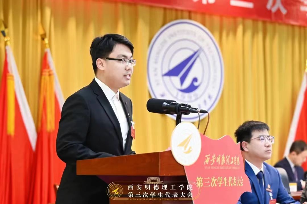 校学生会主席团成员焦磊同学作《beat365vip官网登录入口第三次学生代表大会提案工作报告》。