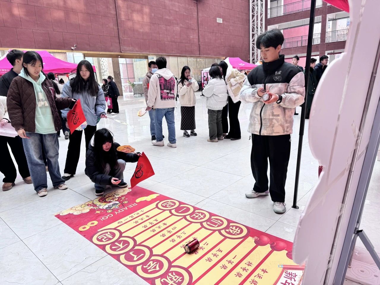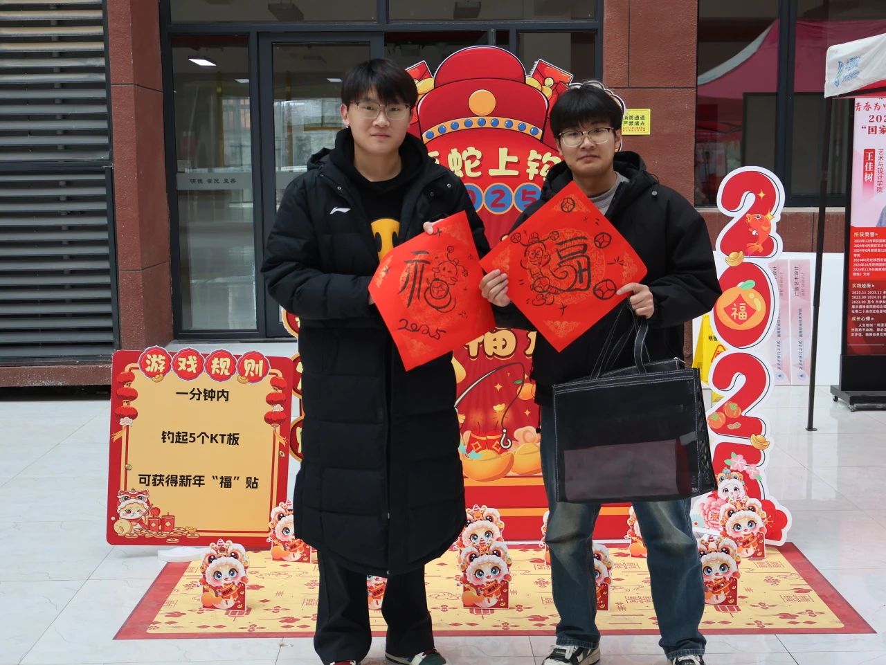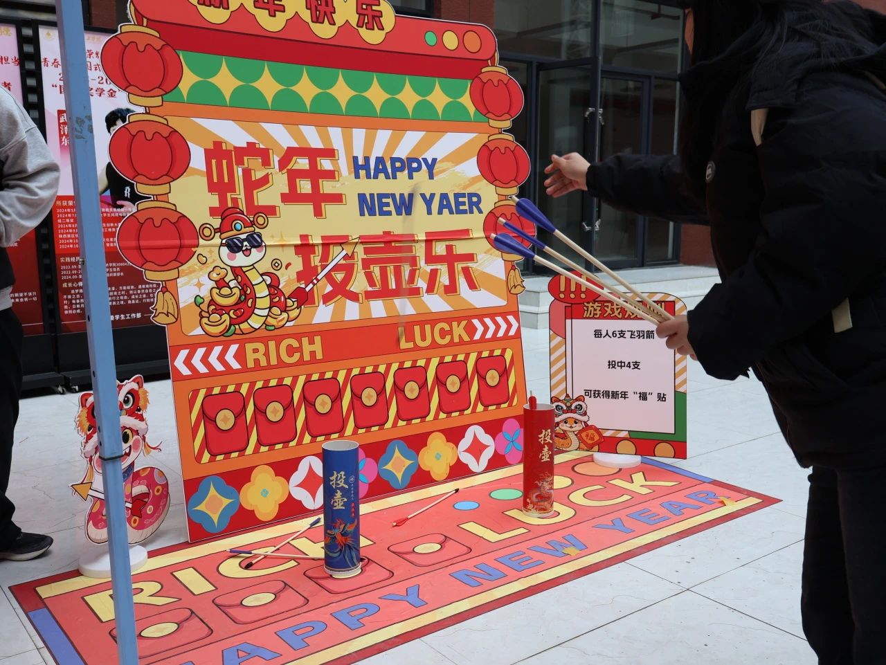 游戏区更是乐趣纷呈,欢声笑语。幸运滚滚乐游戏中,同学们滚动可乐瓶收获惊喜小礼物;灵蛇套圈区,红色的套圈轻盈落下,牵动着同学们的心;蛇年投壶乐游戏中,同学们聚精会神,投入新一年的满满福气;瑞蛇钓福运游戏中,同学们屏气凝神,钓出属于自己的蛇年福气。
