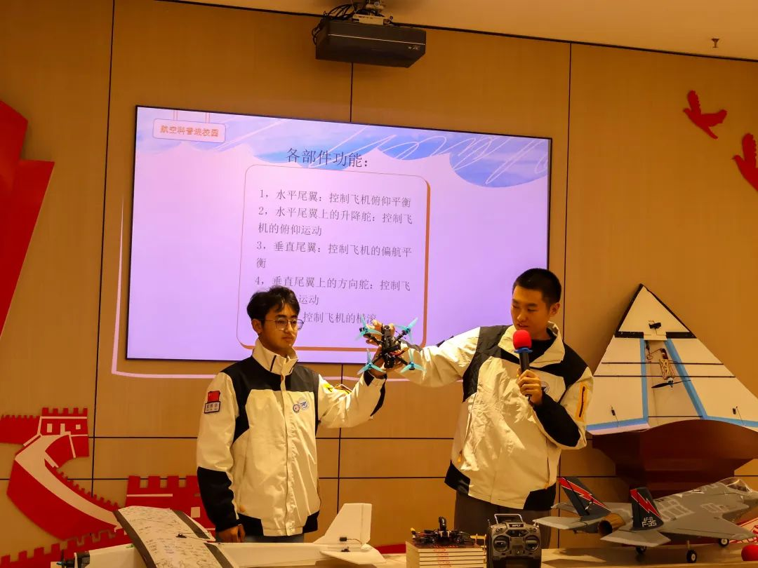 随着活动序幕缓缓拉开,一场精彩的PPT演示吸引了所有人的目光。讲解员巧妙地设置了互动环节,先以提问引发思考,再深入浅出地介绍固定翼飞机的工作原理,包括飞机如何实现转弯、升降,以及不同部件的重要功能。伴随着理论知识的讲解,队员们亲自演示飞机的操控,让抽象的概念变得触手可及,孩子们的脸上洋溢着兴奋与惊奇。