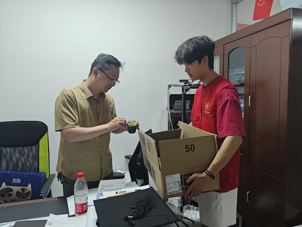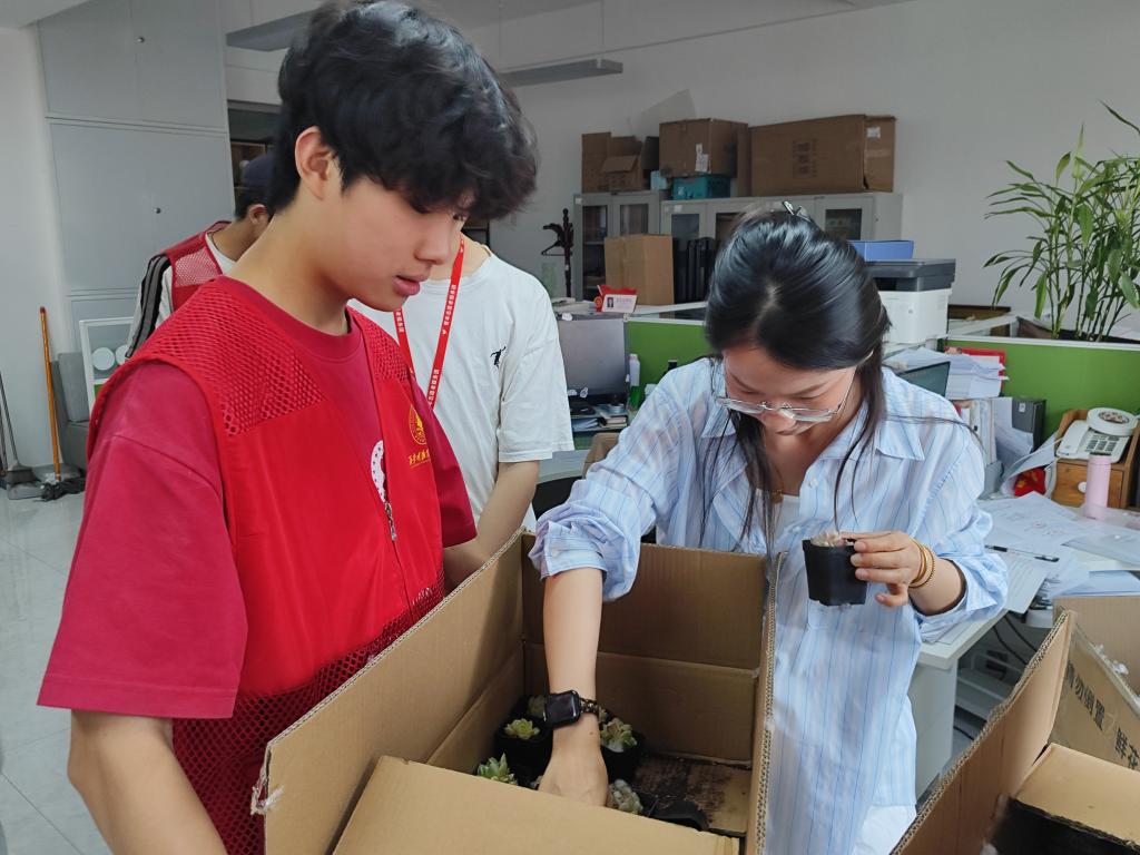志愿者们分组前往各学院办公楼。敲响办公室的门,把绿植交到老师的手中,他们轻声道:“老师,您辛苦了!这是送给您的多肉,希望能为您的工作增添一点活力。” 老师们接过绿植时,眼中满是惊喜,有的老师立刻将绿植摆在办公桌最显眼的位置,老师们的笑容与志愿者的热情,让办公室里洋溢着温馨的氛围,也让感恩之情在绿植的映衬下愈发浓厚。