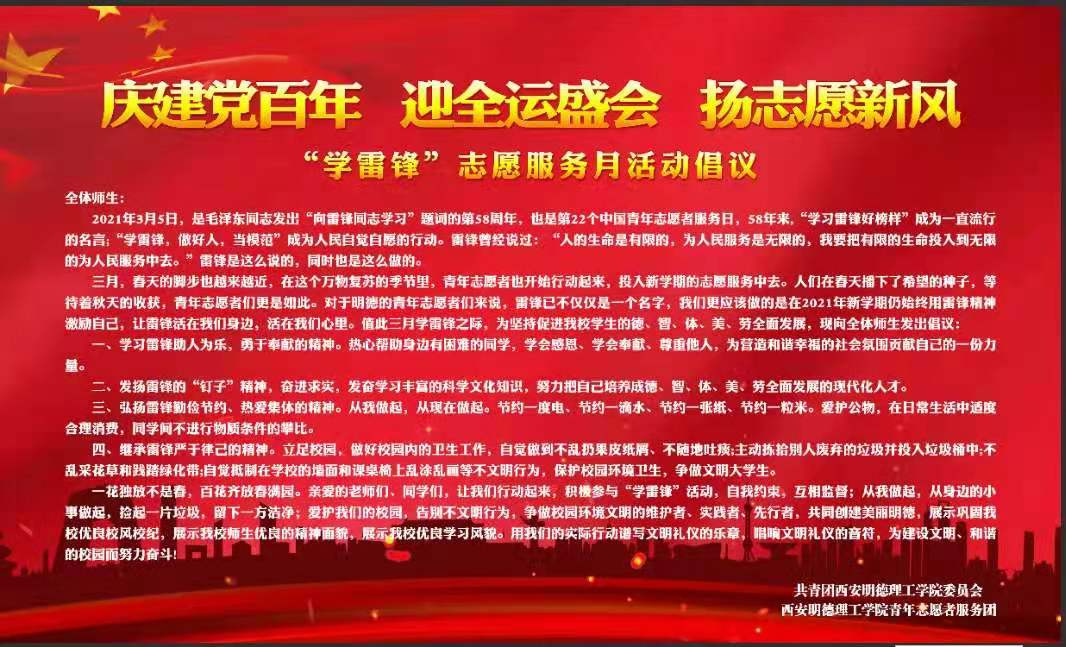 线上接力·传递“锋”范。叮,有一封志愿者倡议书,请您查收。在疫情防控常态化背景下,3月5日,校团委、校青年志愿者服务团,通过线上和线下向全校各级志愿者组织、广大团员青年发布了《庆建党百年 迎全运盛会 扬志愿新风》倡议书,号召广大师生传递“锋”范,争做传承雷锋精神承诺者。这个倡议一发起,便受到广大青年的追捧,大家纷纷主动加入到接力中,掀起了一阵线上“学雷锋”热潮。