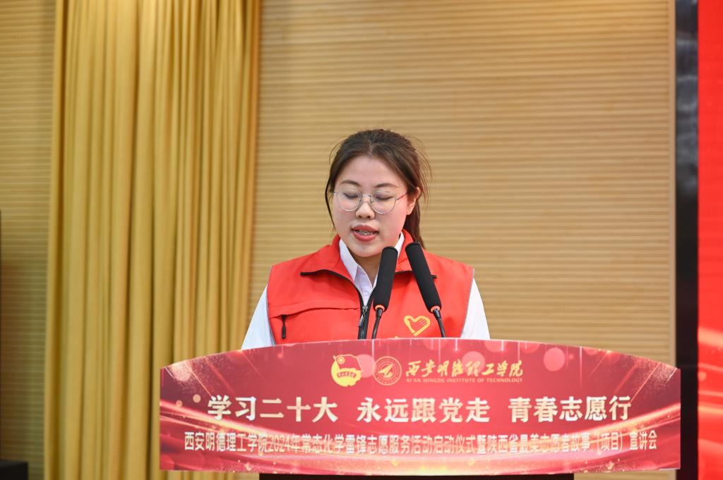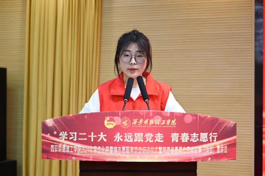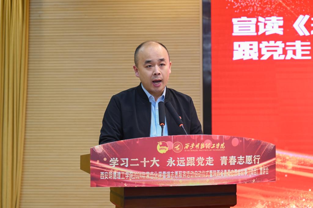 校团委副书记刘雄宣读了《西安明德理工学2024年“学习二十大 永远跟党走 青春志愿行”常态化开展学雷锋志愿服务系列活动安排》。