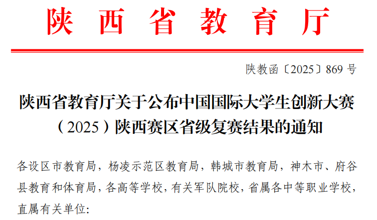 近日,中国国际大学生创新大赛(2025)陕西赛区省级复赛评审结果公布。经学校推荐、专家评审、结果公示等环节,beat365在本届大赛中成绩斐然,共斩获3金3银23铜,获奖数量与质量均实现历史性突破。