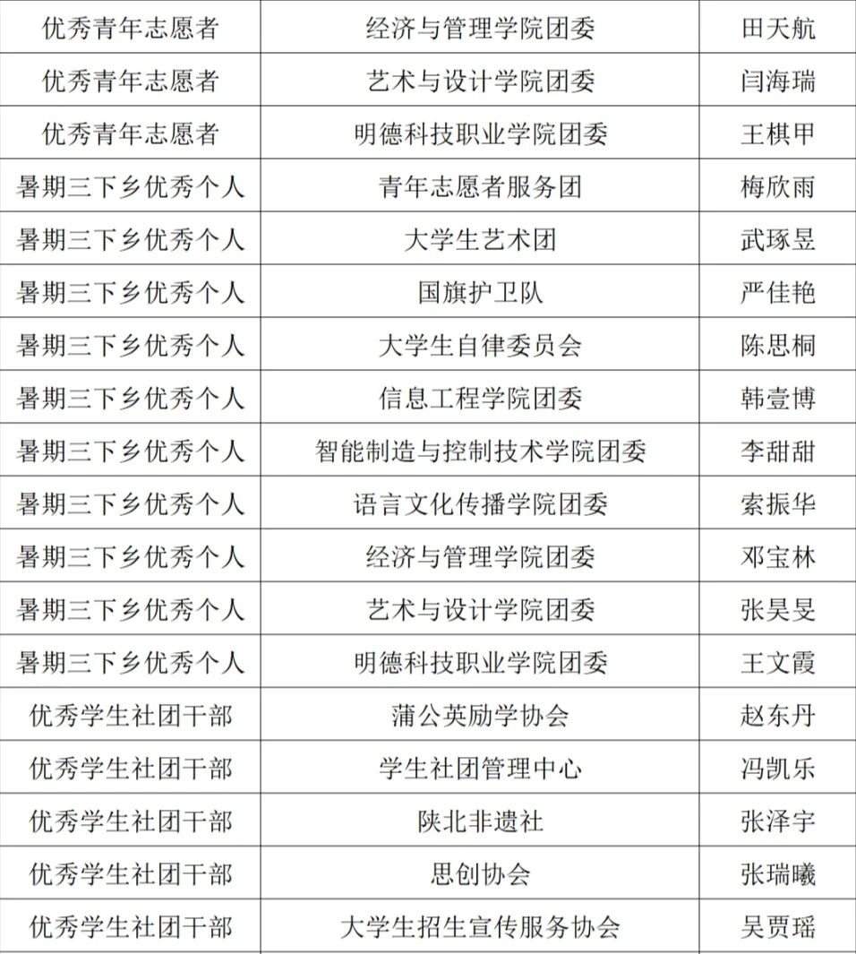 校团委按照学校《关于做好2024-2025学年先进个人、先进集体评选工作的通知》,根据学校《学生手册》要求,经个人申报、各团学组织、学院团委评选,校团委研究决定拟推选以下个人和集体作为2024-2025学年单项奖先进个人和先进集体。特此公示,注:公示三天(2025年10月22日-2025年10月25日),如有异议,请书面提出申请并与校团委联系。电话:029-85603000-8168