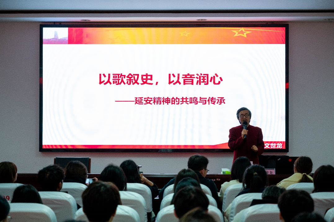 23日晚,同学们在甘泉县党校听取题为《以歌叙述史,以音润鑫心--延安精神的共鸣与传承》的音乐党课。文世龙教授通过讲解陕北民歌《信天游》《黄河大合唱》等歌曲的创作背景、历史文化、唱法技巧带同学们感悟那个我党艰苦奋斗的年代,随后文教授通过自身专业相结合,用英语翻译着陕北民歌,抒情地演唱着陕北民歌,用外国人听得懂的方式,将陕北民歌唱响世界,用自己独特的方式来弘扬爱国精神,联结宗族根脉、传递家国情怀。