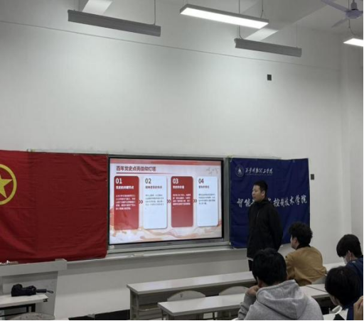 团支书陈焯以“青春告白祖国:学五史,担使命”为主题,带领全班同学展开了一场内容丰富、形式生动的主题团日活动。他首先阐述了学习“五史”的重要意义,引导同学们在历史回顾结束后明确新时代使命。在“时代问卷 青春作答”部分,大家深刻体会到青年命运与民族未来的紧密联系。“三感升华 身份认同”则从认同感、归属感和自豪感出发,引导同学们将“请党放心、强国有我”的誓言,转化为内化于心的信念与外化于行的动力。小组讨论时间,同学们围绕“新时代青年如何以技术创新助力国家发展”展开热烈交流。活动最后,陈焯同学鼓励大家将学习成果转化为持续动力,以实干担当践行青春誓言,在民族复兴的征程中书写无悔青春。