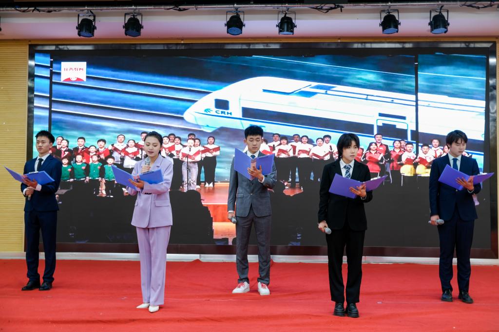 会上,我学校沣河校园广播站的同学们与来自陕西省城镇、乡村幼儿园、中小学校教师、学生代表,职业学校、高等学校教师、学生代表共同朗诵《请党放心,强国有我》。