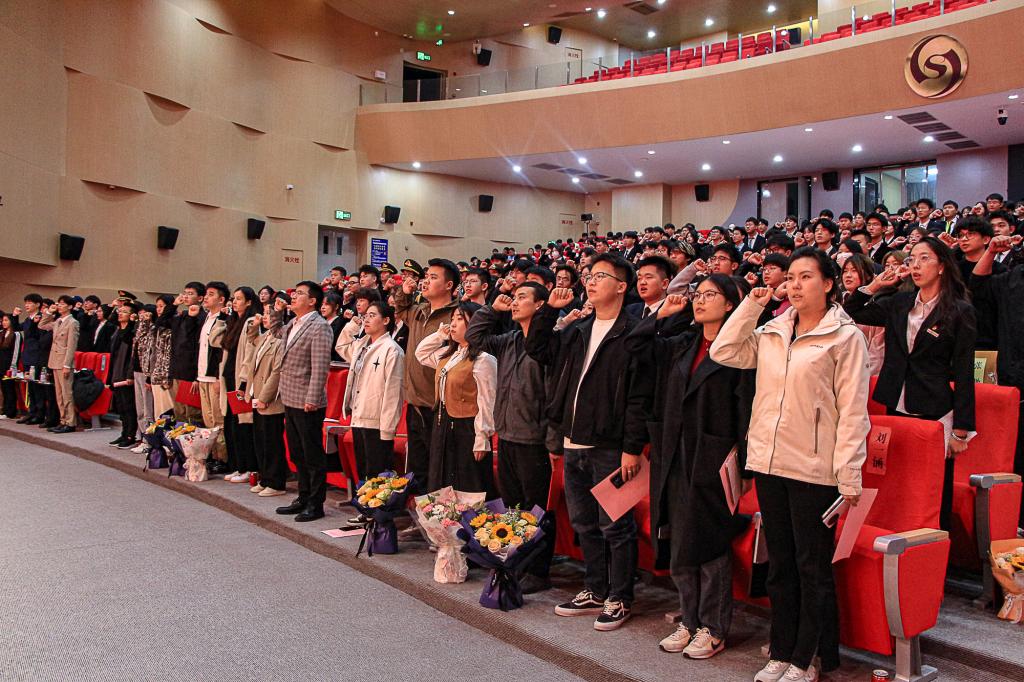 新任学生干部沈美晗带领全2024-2025学年校级学生干部就职宣誓:“以最为饱满的热情与认真负责的态度,为学校事业的蓬勃发展贡献力量”。