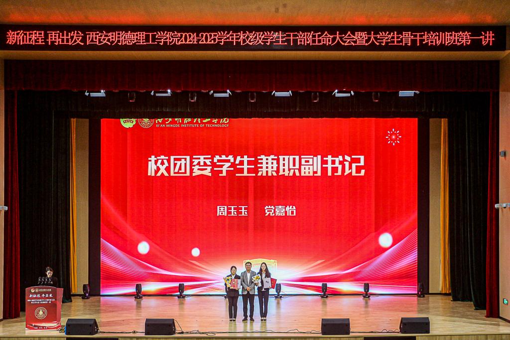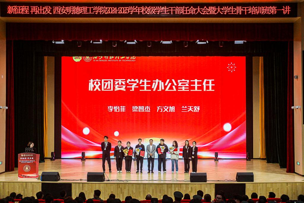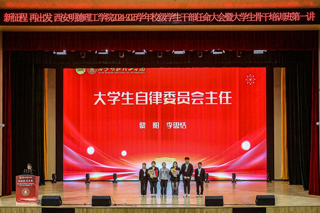 进一步优化学校学生干部队伍建设,推进学校共青团改革,努力建设一支政治觉悟高、工作能力强、作风扎实、品德高尚、敢于担当、自觉奉献的学生干部队伍。10月23日,校团委在四季廊桥报告厅组织开展“新征程,再出发”学校2024-2025学年校级学生干部任命大会暨大学生骨干培训班第一讲。团委书记童杨梓,团委副书记刘雄,大学生自律委员会指导教师李秋红、国旗护卫队指导教师卓西洁,各学院团委书记以及各学生组织代表参加会议,会议由团委老师李丹妮主持。
