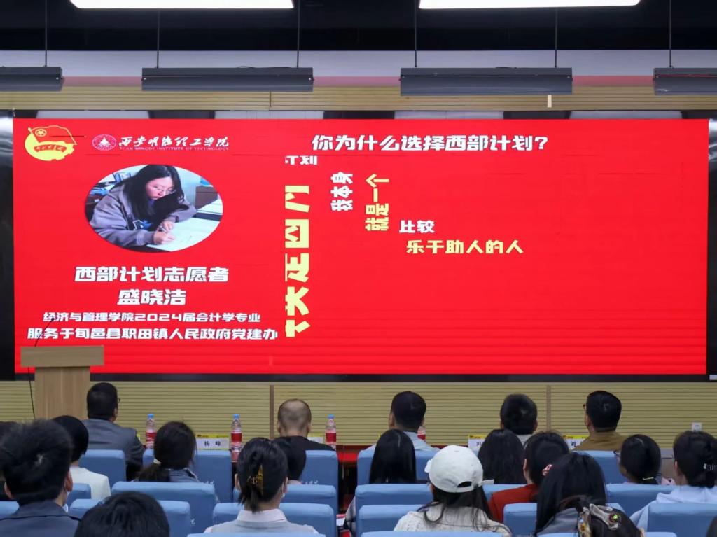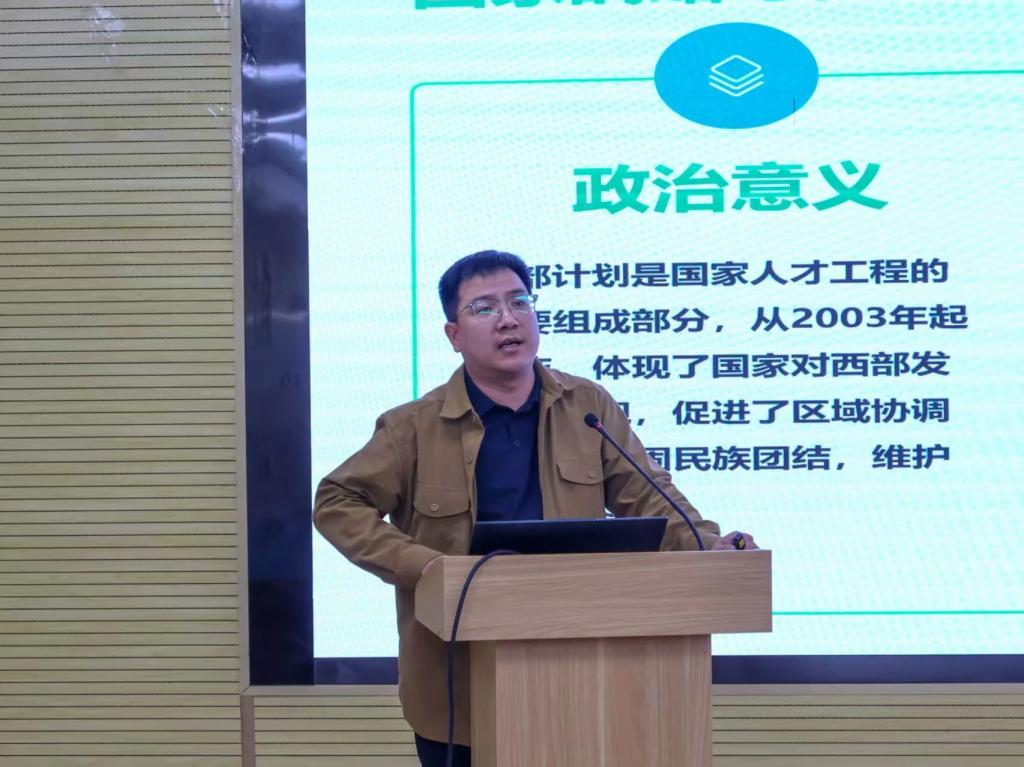 政策引领方向,青春响应号召。会议以“报效祖国 建功西部”为主题,通过政策宣讲、榜样分享、动员答疑等环节,全方位解读西部计划的服务内容、政策保障及报名流程,号召青年学子以奋斗之姿奔赴西部基层,在祖国最需要的地方绽放青春光彩。校团委书记童杨梓在动员讲话中表示:“西部计划是青年学子践行家国情怀的重要平台,希望同学们勇担时代使命,将个人成长融入国家发展大局,用知识和热情为西部建设贡献力量。”