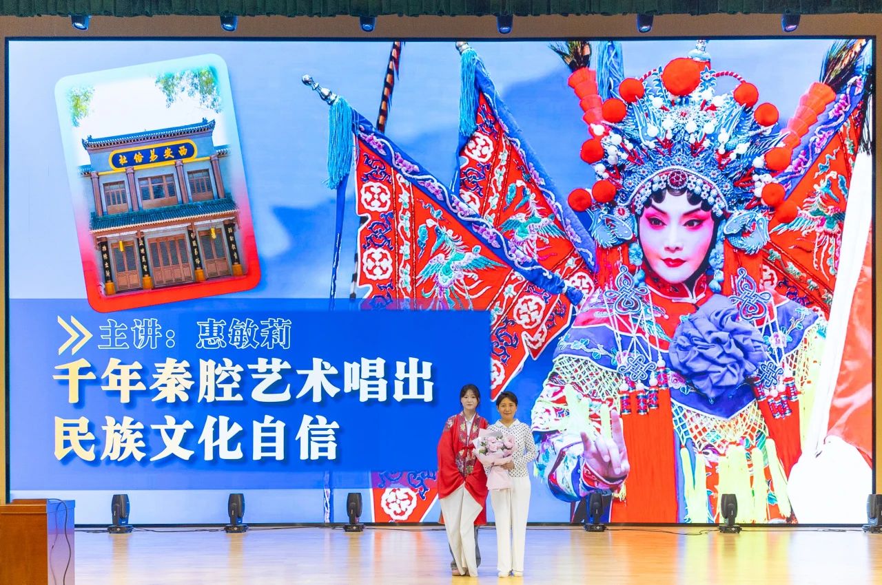 惠敏莉以千年大秦腔的历史嬗变与当代发展为切入点,结合秦腔人面对的挑战与机遇,百年易俗社的守望与新生,围绕秦腔艺术的起源、特点、发展、担当、传承、创新六方面展开讲授。她认为,秦腔作为我国戏曲梆子腔的鼻祖由来已久、深沉厚重、蔚为大观;秦腔秦韵之传播、秦地秦风之状美随时而高亢激昂、时而柔和清丽的“传统新声”专研本体、锐意改革、移风易俗、入百姓家。她指出,秦腔人学不可以已、学不可不精,舞台上应随乐音唱念做打、课堂上且听师者授业解惑;要深化“艺术+学术”双并举发展模式,创新表达方法、融通媒介渠道,让不同受众群体皆能鉴赏秦腔艺术、认可中华戏曲。她希望全体师生胸中有一团“火”、脚下有一阵“风”、眼里有一片“天”,制定好多样“剧本”、扮演好不同“角色”、经营好各自“行当”;守护传统文化、重视美育教育、稳固人才储备,成为时代新舞台上技冠群雄、当仁不让的“主角”。