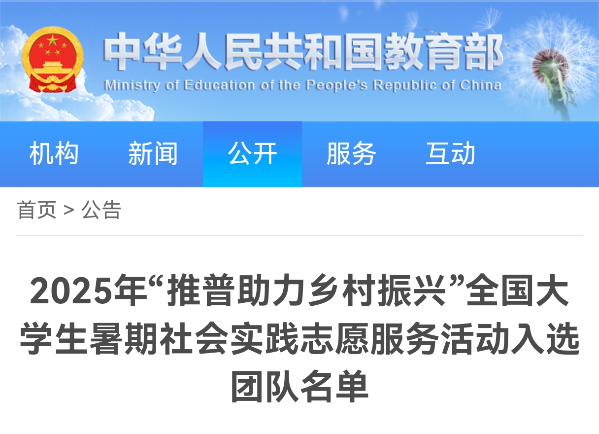 7月3日,教育部正式公布《2025年“推普助力乡村振兴”全国大学生暑期社会实践志愿服务活动入选团队名单》,学校两支暑期社会实践队从全国 1680 所高校的 8013支团队8万余名师生中脱颖而出,成功入选!