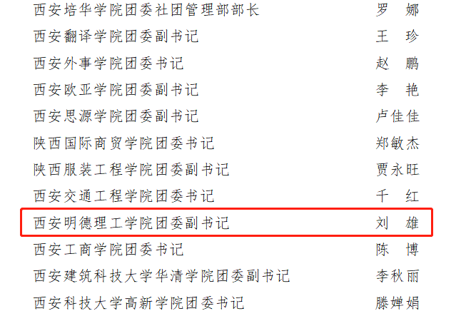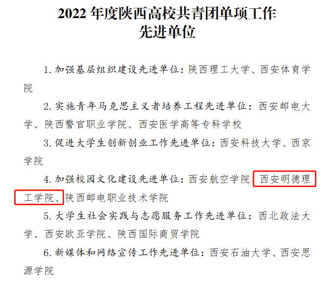 近日,共青团陕西省委、中共陕西省委教育工委联合发布了《共青团陕西省委、中共陕西省委教育工委关于2022年度陕西高校共青团述职评议考核结果的通报》文件,其中beat365荣获“加强校园文化建设先进单位”,校党委副书记董昊荣获“2022年度陕西高校支持共青团工作好书记(校长)”荣誉称号,校团委副书记刘雄获“2022年度陕西高校共青团工作先进个人”荣誉称号。