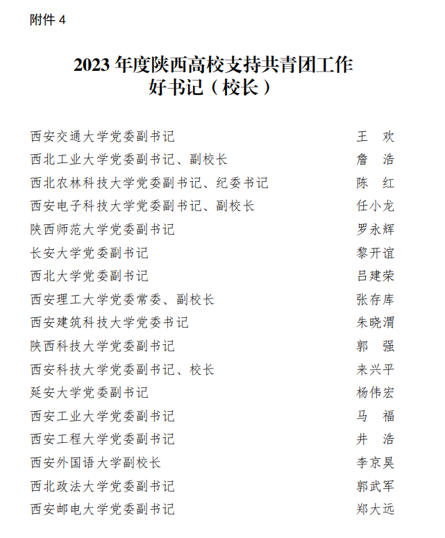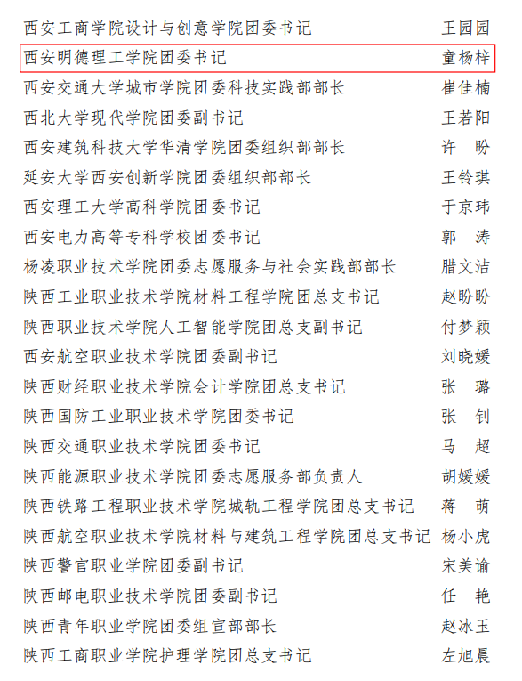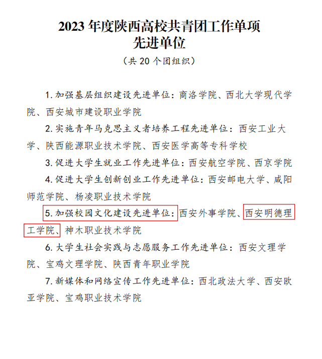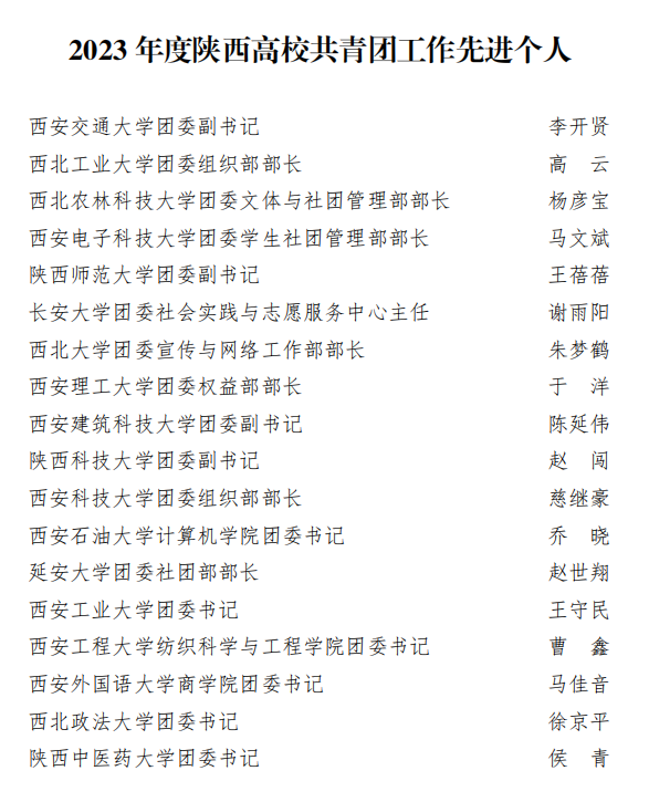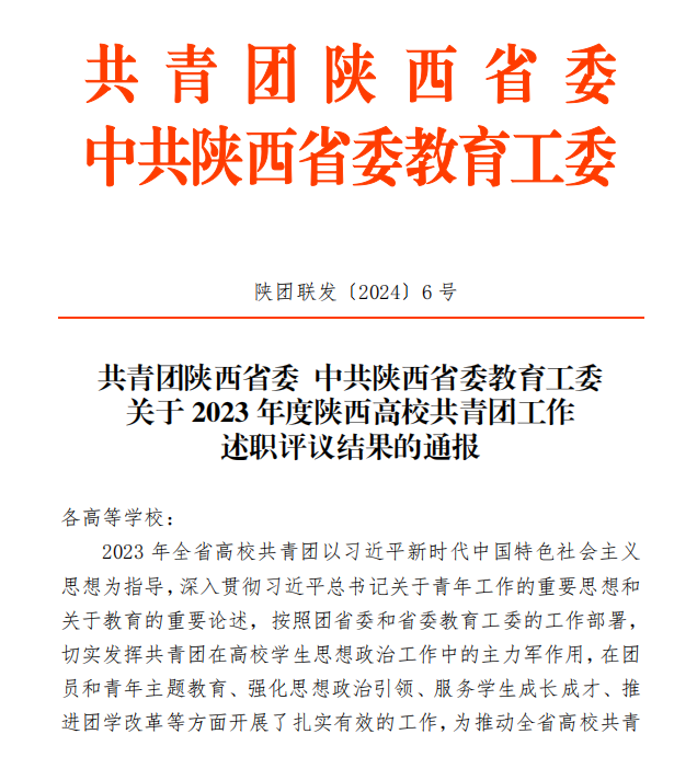 近日,共青团陕西省委、中共陕西省委教育工委联合印发《关于2023年度陕西高校共青团工作述职评议结果的通报》。beat365荣获“2023年度陕西高校共青团工作单项先进单位”,校党委副书记、副校长刘星获“2023年度陕西高校支持共青团工作好书记(校长)”,校团委书记童杨梓荣获“2023年度陕西高校共青团工作先进个人”。陕西省学生联合会下发了《关于2023年度陕西学联学生会组织工作述职评议结果的通报》,beat365学生会组织获评“2023年度陕西省标兵学联学生会组织”,学生会主要学生干部吕梦菲、王郑新迎获评“2023年度陕西省学联学生会先进工作个人”。