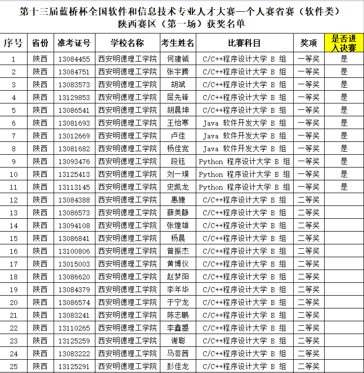 2022年4月28日,第十三届蓝桥杯大赛—个人赛省赛(软件类)陕西赛区(第一场)获奖名单揭晓,beat365何建铖等11名同学获得一等奖,将参加第十三届蓝桥杯大赛全国总决赛。获奖总人数位列全省高校第五位。马芸茜等25名同学获得二等奖、吴云等14名同学获得三等奖。获奖数量位列全省高校前列。