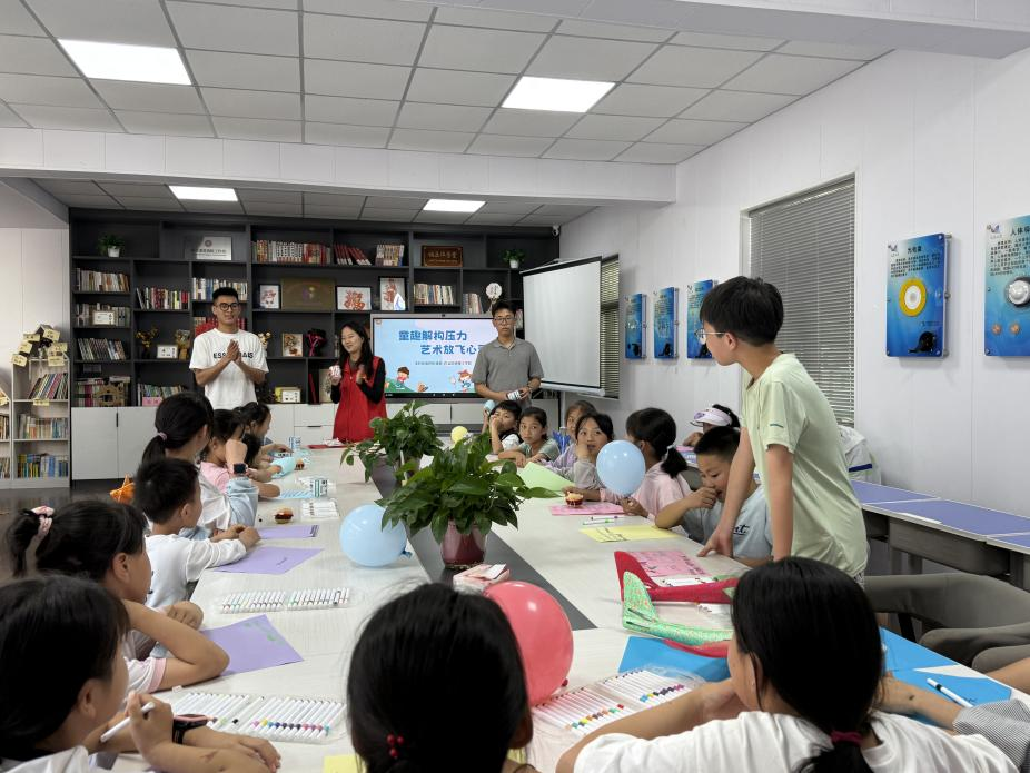 “释放压力球”拉开了活动序幕,瞬间点燃了孩子们的创造力。在大学生志愿者的悉心引导下,原本普通的彩色气球、彩纸、胶水等材料摇身一变,成为孩子们手中的“解压工具”。孩子们全神贯注地投入到装饰气球的活动中,将气球精心打扮成独一无二的“压力球”。每一次吹气,仿佛都是他们释放心中烦恼的过程,气球逐渐膨胀,孩子们的笑声也愈发响亮。