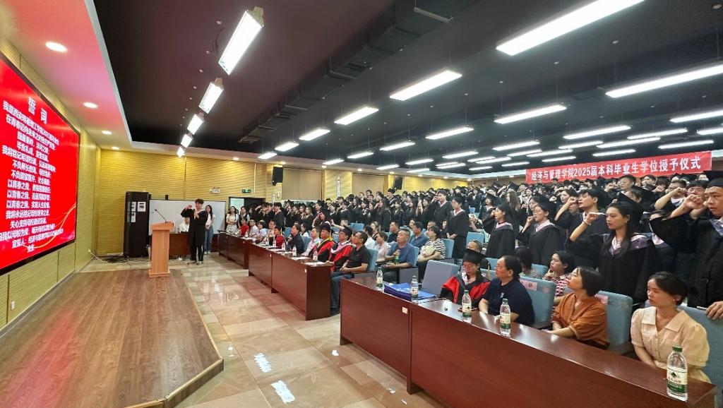 6月24日上午,经济与管理学院在建德楼201报告厅举行2025届本科毕业生学位授予仪式。学校副校长陈鹏、经济与管理学院党委书记兼行政副院长何文举、副院长许萍、副书记冯纪潮、学院学位委员会主席毛加强教授、学术委员会主席桑晓靖教授及各专业负责人、教师代表、家长代表、2025届毕业班辅导员和毕业生共同见证了这一重要时刻。学位授予仪式由冯纪潮主持。