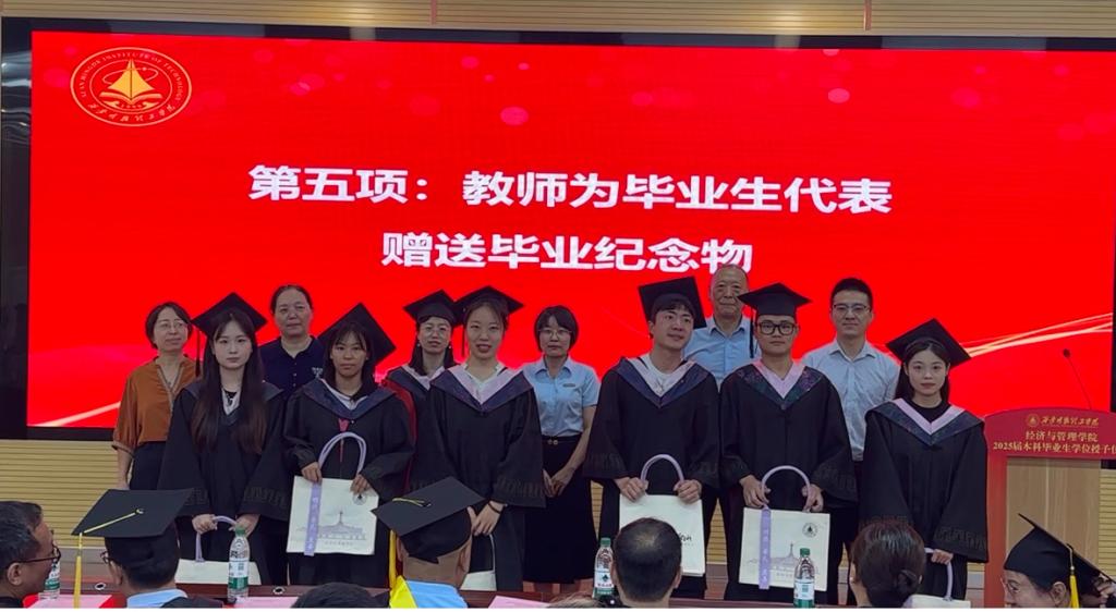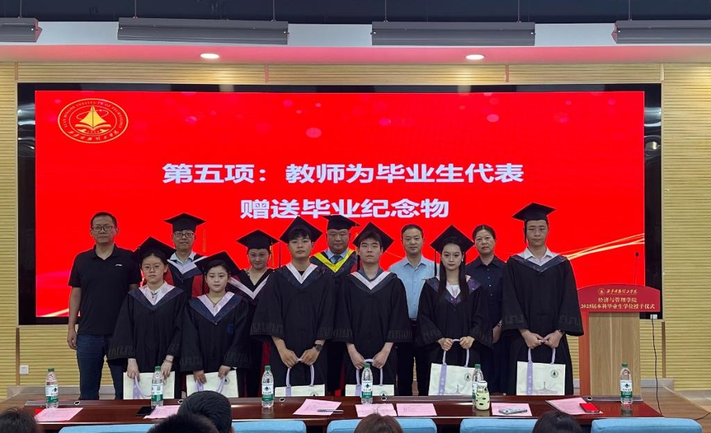 校院领导和教师代表为毕业生代表赠送学院为毕业生定制的纪念物。