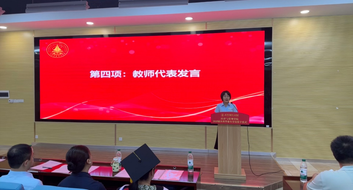 教师代表、学院教学督导组组长薛培芹教授在发言中鼓励毕业生永葆感恩之心、学习之志和家国情怀,做一个懂得感恩、终身学习、心系家国的人。她讲到,在人工智能时代,保持求知的热情和终身学习的态度至关重要,希望毕业生们将个人价值融入国家和社会发展中,在担当中成长,在奉献中成就自我。