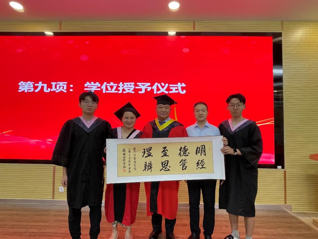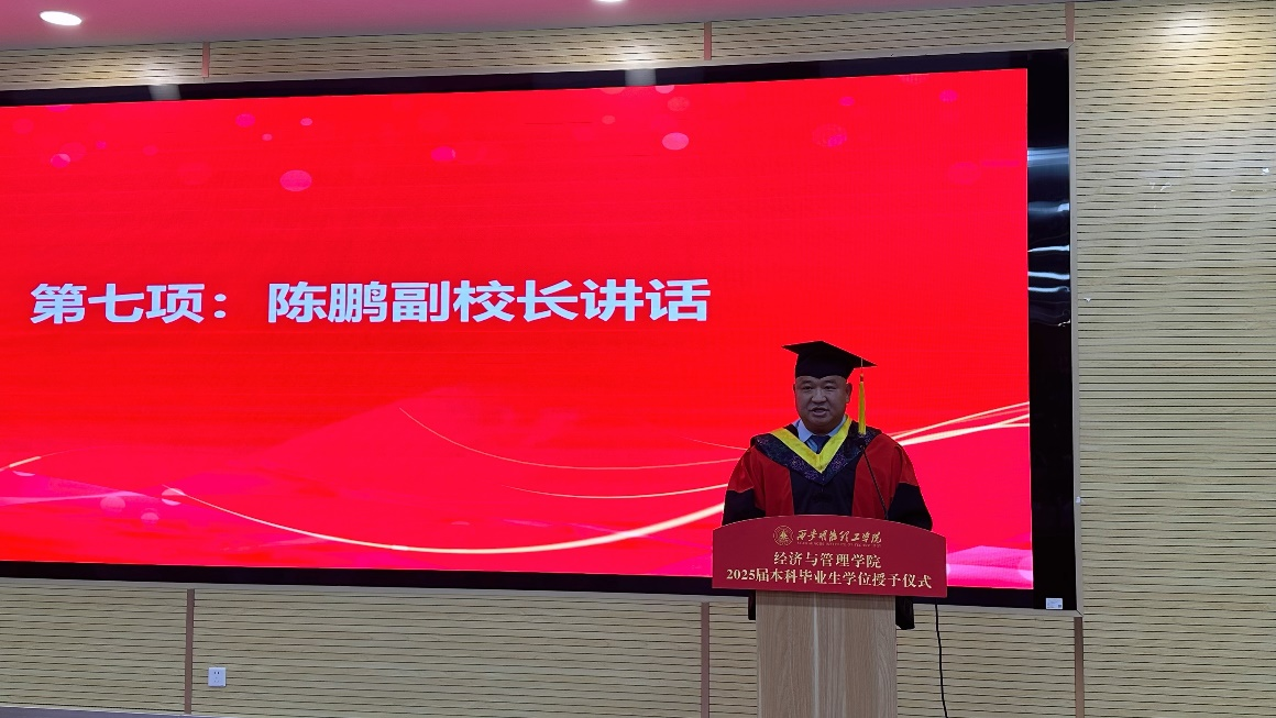 陈鹏副校长在讲话中满怀深情与期望,临别之际,亲切寄语毕业生们:永怀感恩之心、修得包容之量、锻造坚强之志、恪守初心之纯;以“修身齐家”的品格守护精神家园,以“经世济民”的担当贡献专业力量,以“终身学习”的姿态应对时代变革;牢记经管人“明德修身、经世致用、止于至善”的誓言,在数字经济的大潮中勇立潮头,在民族复兴的征程上书写华章。欢迎同学们常回家看看,母校永远是大家扬帆时的港湾,远征时的后盾。