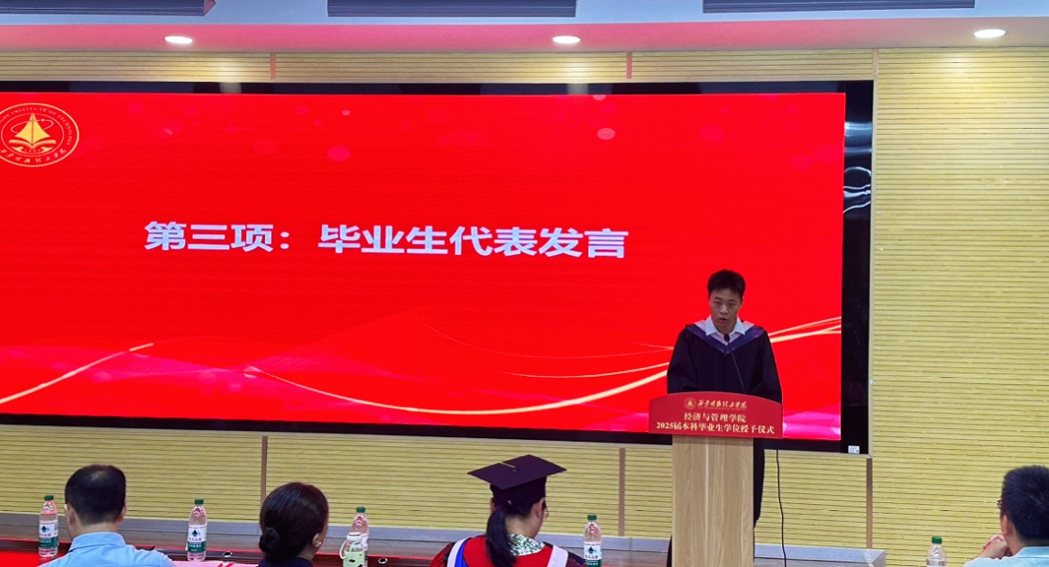何文举代表学院进行致辞,向圆满完成学业的毕业生们表示热烈祝贺,向倾心育人的教师和无私支持的家长致以衷心感谢。他回顾了经济与管理学院近年来在专业建设、人才培养、管理服务、科学研究、产教融合等方面的成绩,分享了优秀学子的突出事迹,激励同学们向榜样学习,立大志、明大德、成大才、担大任,以青春之火,传承明德人的精神特质,到祖国和人民最需要的地方建功立业,以实际行动书写绚丽的青春华章。