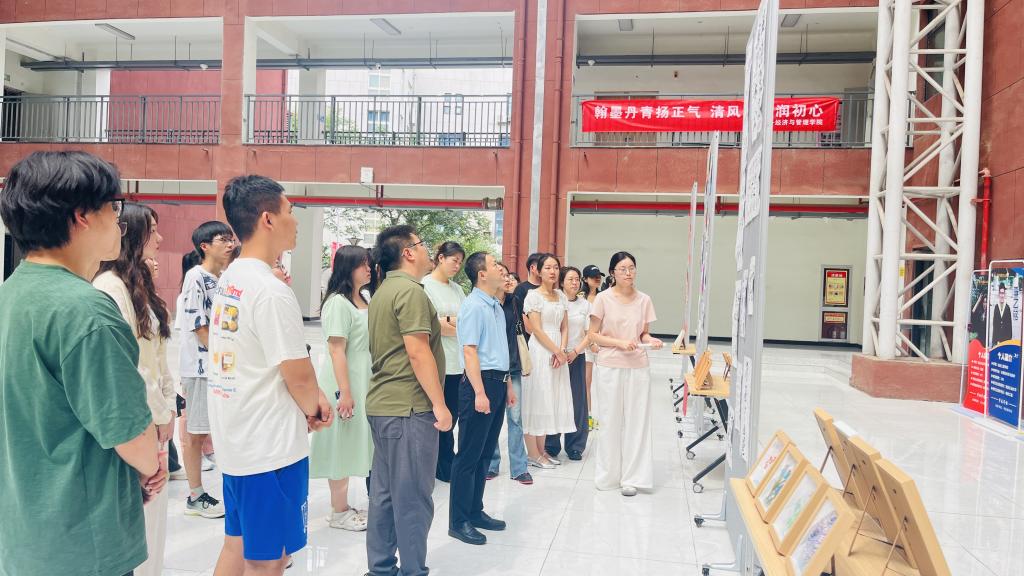 为深入推进廉洁文化建设,将职业道德教育融入专业人才培养,7月3日,经济与管理学院在明志楼中厅举办“一院一品”财会文化节廉洁文化作品展。学院党委书记兼行政副院长何文举、副书记冯纪潮、各年级辅导员代表、学生代表在2022级辅导员邹代柳的引导下共同参观展览。
