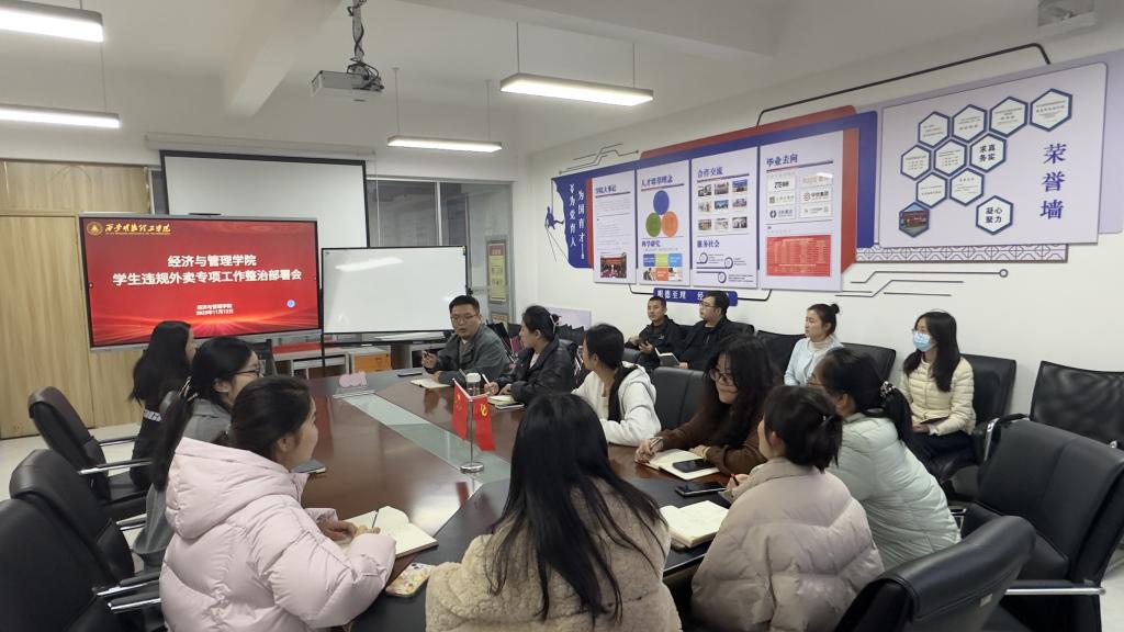 为筑牢校园安全防线,切实保障学生安全,11月12日,经济与管理学院召开学生违规外卖专项工作整治部署会。学院全体辅导员参会,会议由学院党委副书记冯纪潮主持。