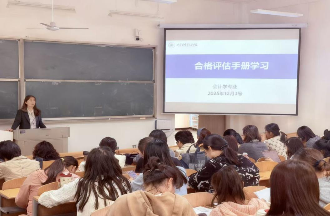 会议伊始,张荣斌介绍了本次学习的背景与意义。她指出,本科教学工作合格评估是检验高校办学基本条件、教学质量与人才培养成效的重要手段。会计学专业作为学院办学规模最大的专业,要以评估为契机,系统梳理教学过程中的关键环节,强化“以学生为中心”的教育理念,全面落实“五位一体”教学质量监控机制。她强调,每位教师都应主动学习评估文件,熟悉评估流程,确保在迎评工作中做到心中有数、行动有力。