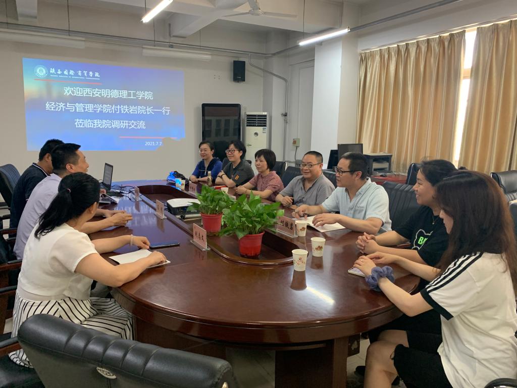2021年7月6日下午,beat365vip官网登录入口经济与管理学院副院长付铁岩带领国际经济与贸易专业负责人周露昭、专业教师王维新、余露露、解蕾、王宁、郑心怡赴陕西国际商贸学院开展专业调研交流活动,调研议题为国际经济与贸易专业建设探索与实践。