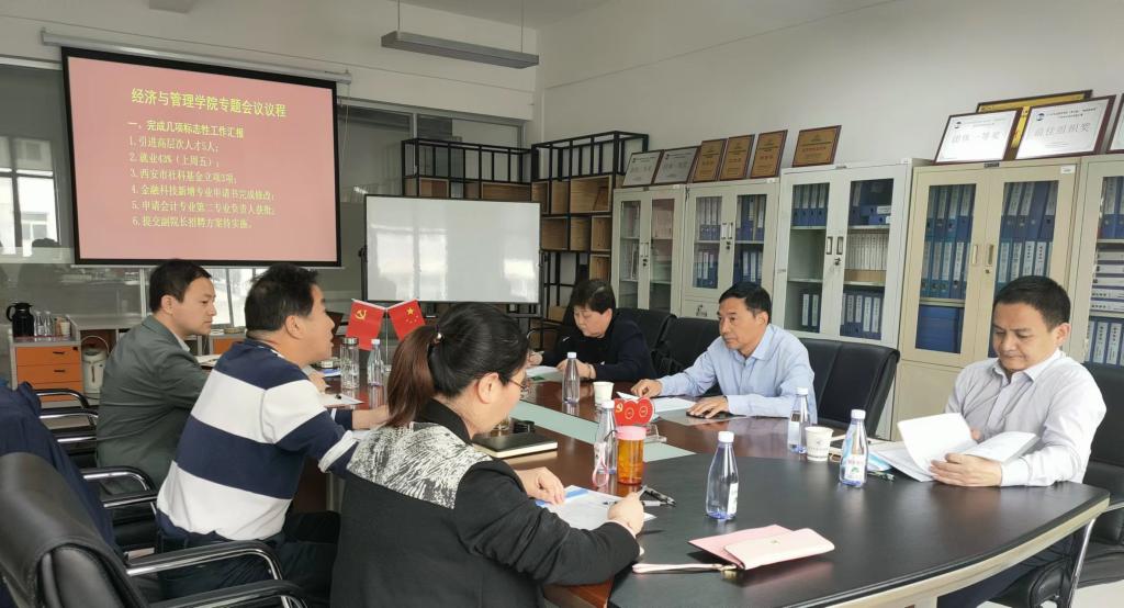 会议伊始,郭院长对校领导莅临学院指导工作表示欢迎,对校领导给予学院发展的关心和支持表示感谢,并向校领导说明召开本次专题工作会议的目的。紧接着,郭院长从高层次人才引进、学生就业、教改科研、新专业申报、师资队伍建设等方面汇报了开学以来经济与管理学院所开展的工作,重点就能源经济研究中心建设方案向与会校领导进行了汇报。刘敏副院长就学院联合培养开设冠名班事宜进行了汇报;何文举书记就开学以来毕业生就业工作,学院访企拓岗促就业专项行动开展情况,学院赴陕西省中小企业服务中心参访等事宜进行了汇报。
