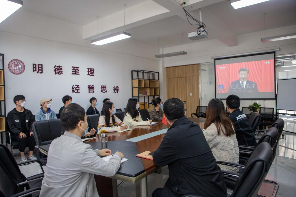 10月16日上午10时,中国共产党第二十次全国代表大会在人民大会堂隆重开幕,习近平总书记代表第十九届中央委员会向大会作了报告。经济与管理学院组织在校的党支部书记、党建专干、分团委书记、年级组长以及学生党员代表在学院507会议室集中观看二十大开幕会,其他师生在各党支部、班级的组织下,在家庭、自修室、宿舍等场地收看开幕会,一起认真聆听习近平总书记向大会所作的报告,第一时间学习领会大会精神。