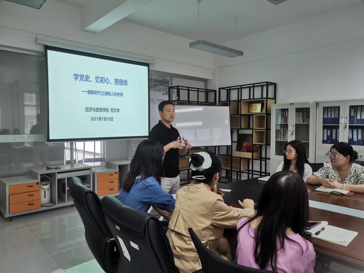 恰逢庆祝建党百年之际,为扎实推进党史学习教育,帮助辅导员队伍提升素质能力。7月10日,经济与管理学院党委书记何文举在明志楼北507以“学党史、忆初心、担使命”为题,为经济与管理学院全体辅导员讲授党史学习教育专题党课。
