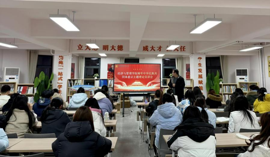 12月1日晚,经济与管理学院在“一站式”学生社区梅苑学生发展赋能中心开展铸牢中华民族共同体意识理论宣讲教育活动,各年级50余名学生代表参加了活动,活动由辅导员井小林主持。