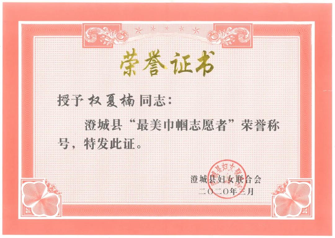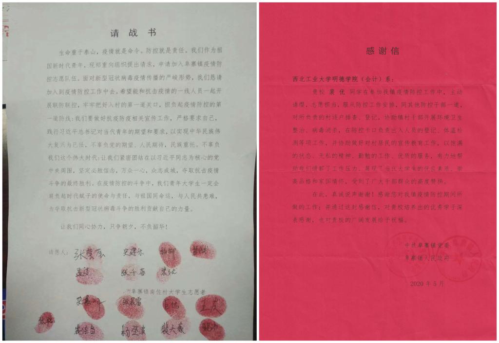 2018级专升本金融学专业204021801班权夏楠同学主动请缨,自愿申请加入家乡抗疫队伍,在村口对进出车辆一一检查并详细登记人员和车辆信息,对村民讲解防疫相关知识,表现突出,得到一致好评,荣获渭南市澄城县“最美巾帼志愿者”荣誉称号。