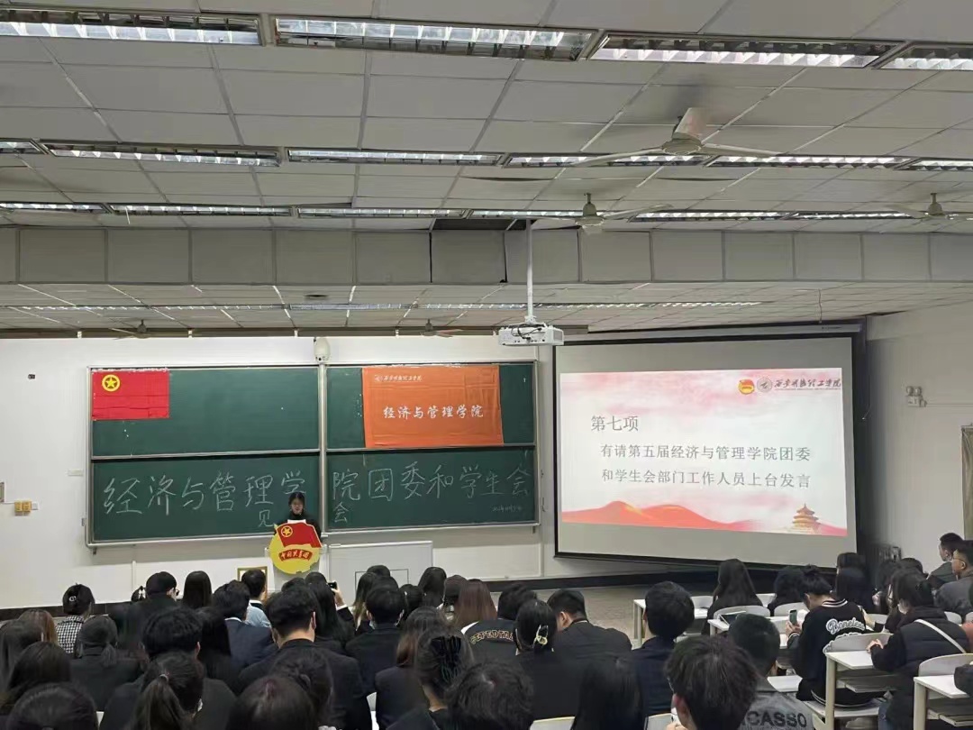 会议第六项、第七项,第五届部门负责人代表、部门工作人员发言,表明未来将会认真工作,充分发挥团学干部的模范带头作用,将经济与管理学院团委和学生会越办越好。