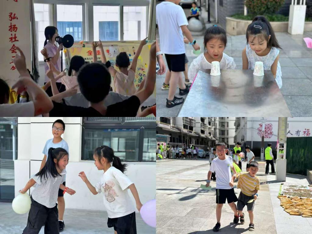 实践队将“传统+创新”理念融入体育课程设计,激发乡村儿童运动热情。在社区广场上,队员们化身活力教练,一招一式地教授标准广播体操动作,广场上跳跃着青春节奏。除此之外,还组织开展了丰富多彩的“童心筑梦·快乐成长”主题游园会活动,在“二人三足”“背靠背运球”等项目中,小朋友的笑声、加油声,与偶尔跌倒后立刻爬起的坚强交织,生动诠释团队协作魅力与奋力拼搏的体育精神。
