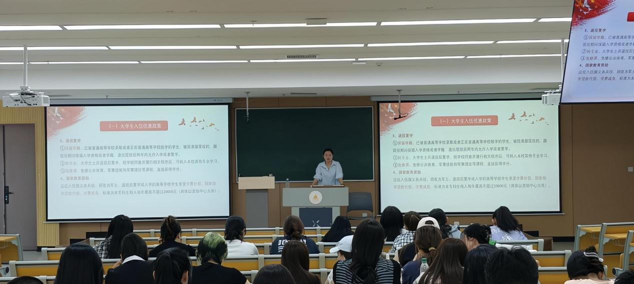 会上,吕盼围绕国防教育价值、中国武装力量构成、大学生入伍优惠政策、退役安置政策及入伍报名条件与流程等方面进行了系统解读。她强调,国防是国家生存和发展的安全保障,大学生应积极履行国防义务,将个人成长融入强国强军伟大事业。吕盼详细介绍了大学生参军入伍系列优待政策,包括免试专升本、考研加分、专项招生计划、学费补偿代偿、转专业优先、就业安置、定向招录等,结合陕西省最新标准,讲解了义务兵家庭优待金、部队津贴、退役金等经济待遇,让学生们直观感受到“学业经济双护航”的政策红利。