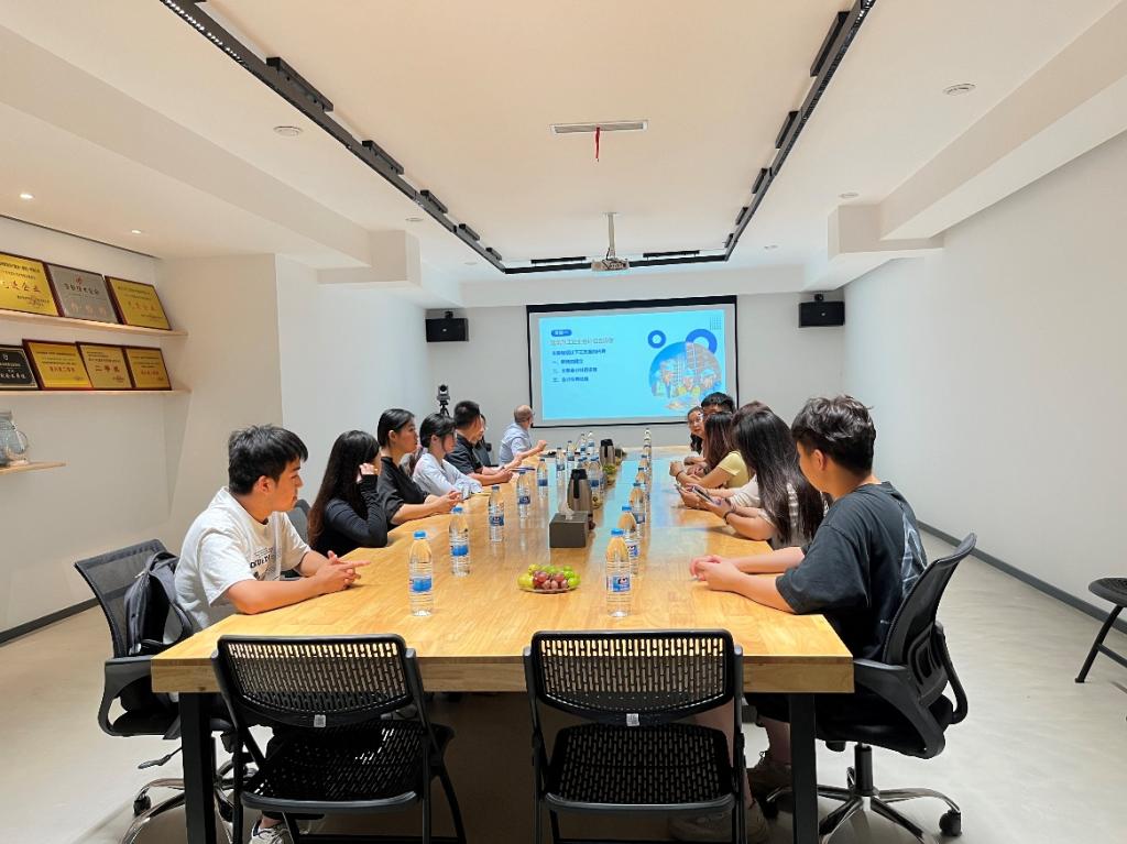 企业总经理董庆喜对学院师生的到来表示热烈欢迎,从发展历程、业务板块、校企合作、服务社会等方面介绍了企业概况。他谈到,企业致力于科技教育事业发展,持续打造教育科技产品设计、研发、智慧实训整体解决方案、云课堂、竞赛支撑、双碳业务等,助力数字经济人才培养,服务社会发展和产业升级。张荣斌对企业方的热情接待表示感谢,并说明本次调研的目的。