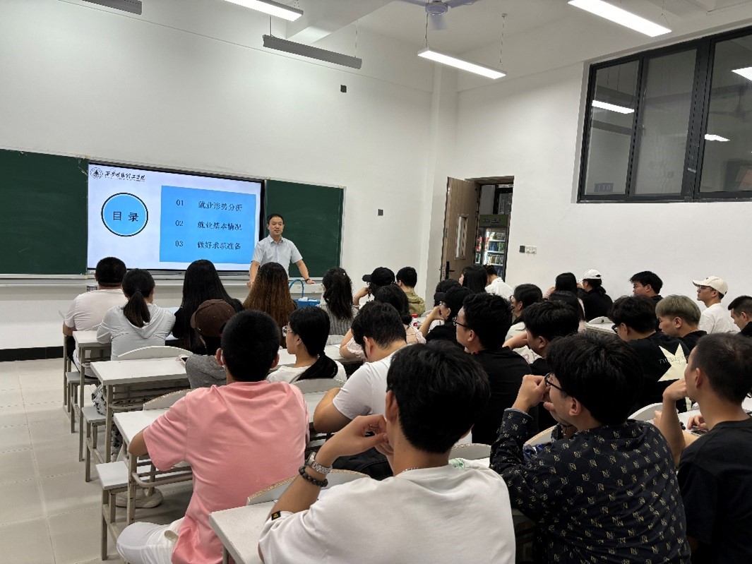 何文举老师从“就业形势分析”、“就业基本情况”、“做好求职准备”三个方面为毕业生们开展了就业指导。他强调,职业规划是大学生活的重要组成部分,勉励毕业生尽早明确自己的职业目标,制定合理的职业规划,并为之不懈努力。他还介绍了学院为毕业生提供的就业指导服务,包括简历制作、面试技巧培训、就业信息推送等,鼓励同学们充分利用这些资源,提升自己的就业竞争力。