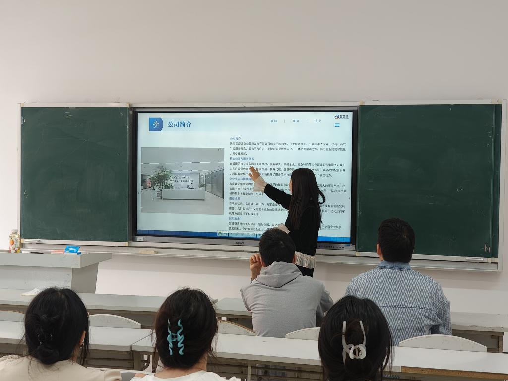 陕西富盛谦企业管理咨询有限公司人事经理刘娟从企业文化、发展历程、业绩趋势、合作单位、业务分类明细、喜报荣誉、竞争优势、福利待遇等方面详细介绍了企业概况,加强了毕业生对用人单位的了解。宣讲结束后,人事经理刘娟、人事主管黄茜就毕业生所关心的岗位能力标准、工作内容、证书要求、入职时间等问题进行现场答疑,气氛热烈融洽。