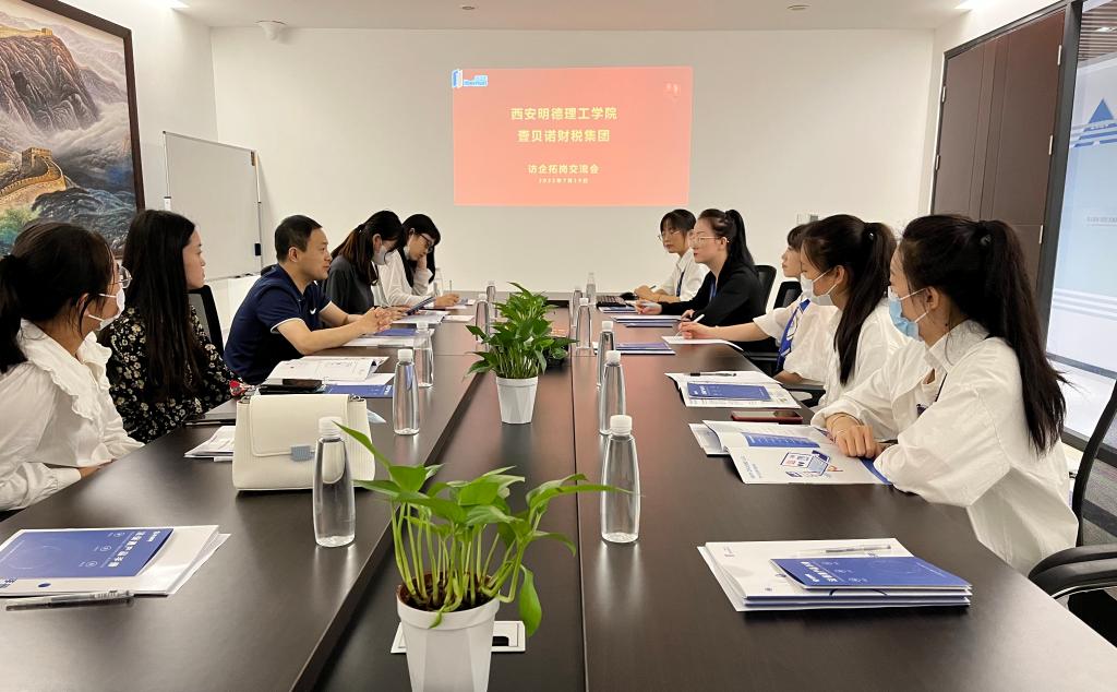 7月19日,参访团赴西安壹贝诺财税管理有限公司调研,在人力资源总监张思静和人事主管井冬婷的陪同下,师生们参观了企业办公环境、文化墙和业绩展览墙,并看望入职该单位的2022届会计学专业毕业生吴莎莎,了解毕业生岗位适应情况及工作现状。座谈会上,井冬婷从企业发展历程、文化理念、工作氛围和福利待遇等四个方面介绍了企业概况;何文举向企业介绍了beat365vip官网登录入口概况和经济与管理学院基本情况,并说明本次调研目的;校企双方就开展校园招聘、建立实习就业基地等事项进行深入交流,气氛热烈。