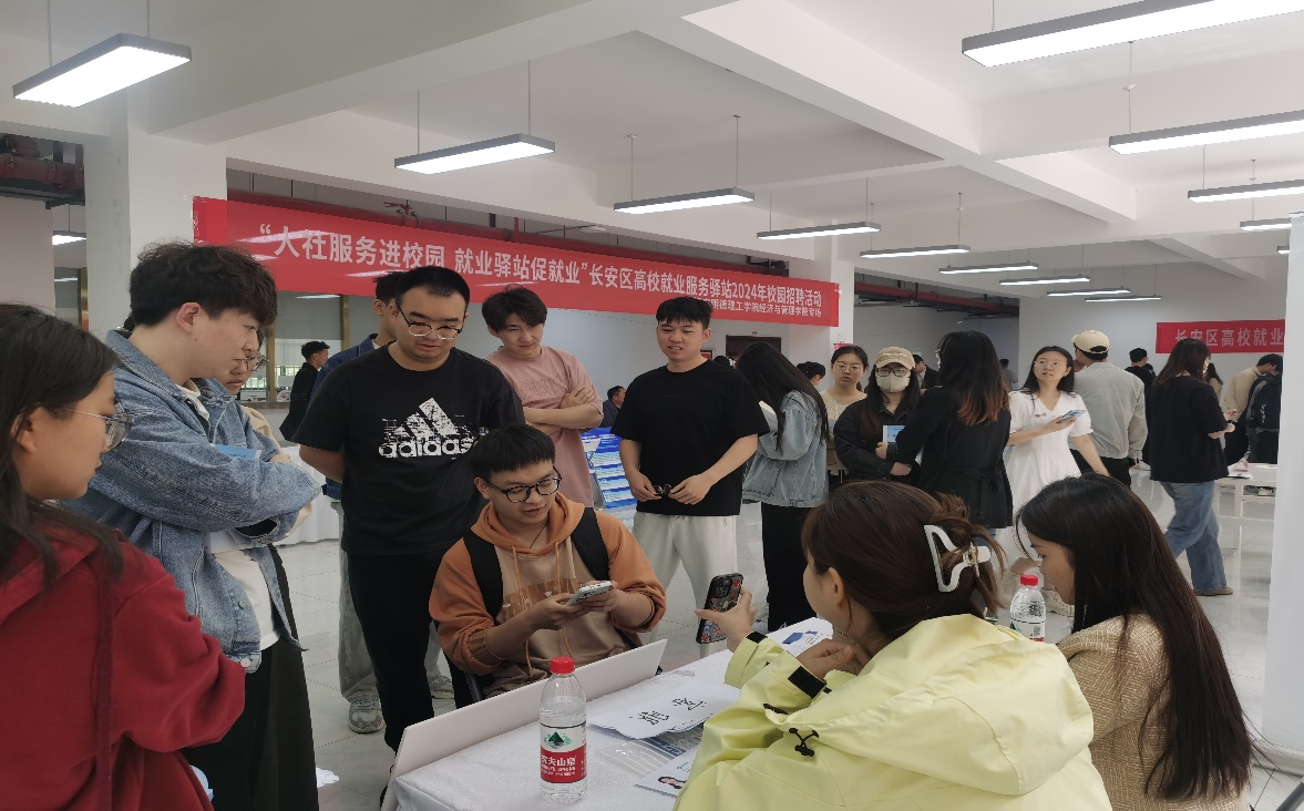 随后,与会政校企领导在招生就业中心、经济与管理学院班子的陪同下到招聘会现场了解企业用人需求、毕业生应聘等情况,并与企业代表、毕业生亲切交谈。校长王志刚表示,就业是最大的民生工程,在2024届毕业生就业工作“百日冲刺”阶段,长安区人力资源和社会保障局联合猫头英招聘平台为经管类毕业生提供就业供需机会表示感谢,对促进学校毕业生高质量充分就业充满信心。招聘会期间,经济与管理学院2024届、2025届毕业班辅导员深入会场与用人单位沟通交流,推动“访企拓岗”专项行动。