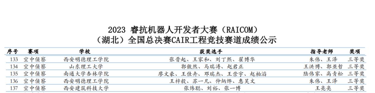 9月16日,由工业和信息化部人才交流中心、RoboCom国际公开赛组委会联合主办的2023睿抗机器人开发者大赛(RAICOM)总决赛在武汉市江汉大学圆满闭幕。本次大赛中智能制造与控制技术学院首次派出代表队参加比赛,最终在空中侦察赛项中获得三等奖两项。