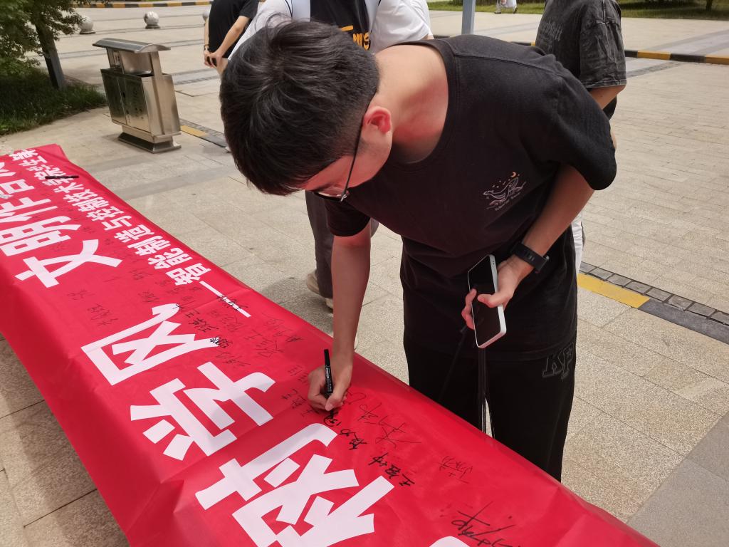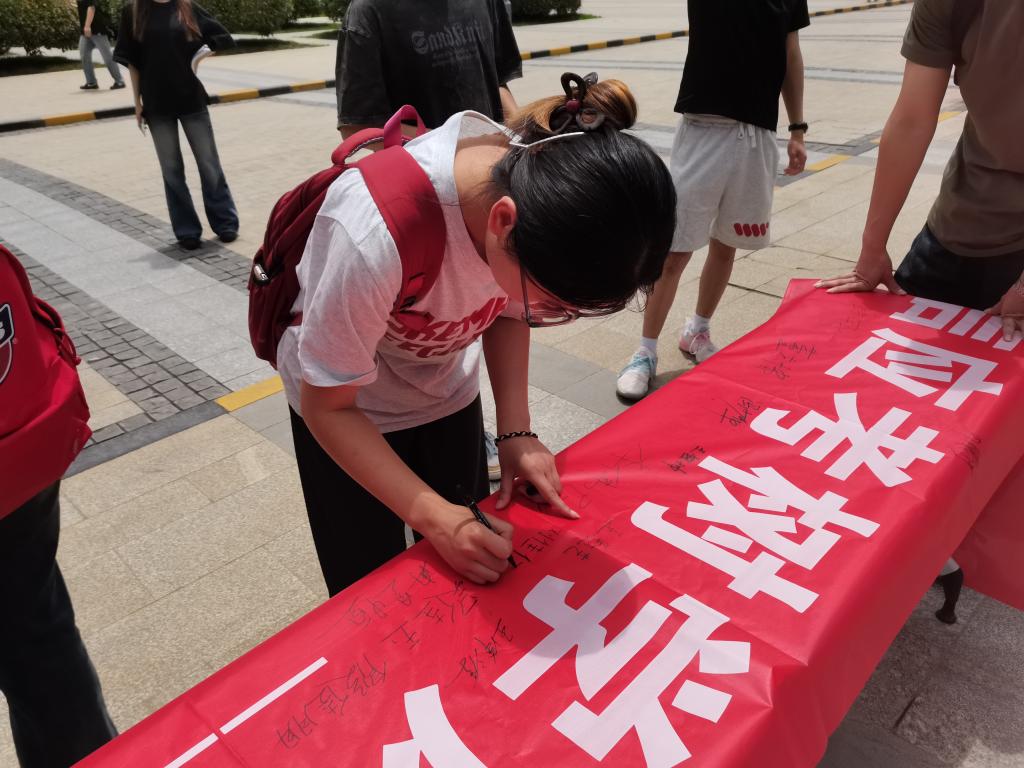 时值备考关键阶段,此次活动旨在以生动形式深化诚信教育。广场“诚信应考树学风,文明作答展风采”的鲜红横幅格外醒目,吸引了不少师生驻足观看。无声传递着对诚信品格的庄严召唤。支部成员热情洋溢,积极向过往同学阐释诚信考试的重要意义,并诚挚邀请大家在横幅上郑重签名,以笔为誓,许下一份对自己学业与品格的坚定承诺。同学们反响热烈,纷纷驻足,欣然提笔,让承载着责任与担当的名字在横幅上汇聚成一股强大的诚信力量。