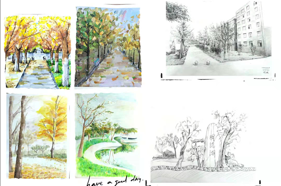 绘画活动经过前期精心准备、组织和动员,学院2020级视觉传达设计、产品设计和工业设计专业学生利用课余时间用画笔向明德告白,表达爱校之情。同学们将学院校门、图书馆、明德湖、建德楼、芳菲路和生活区等标志性建筑、自然景观等以素描、速写、水粉、彩铅绘画作品形式展现出来,用心发现学院美景、记录美景,表达他们对明德的热爱之情。本次绘画大赛共收到200余幅作品,经过专业教师评审,共评选出一等奖作品4幅、二等奖作品6幅、三等奖作品12幅和优秀奖作品20副。