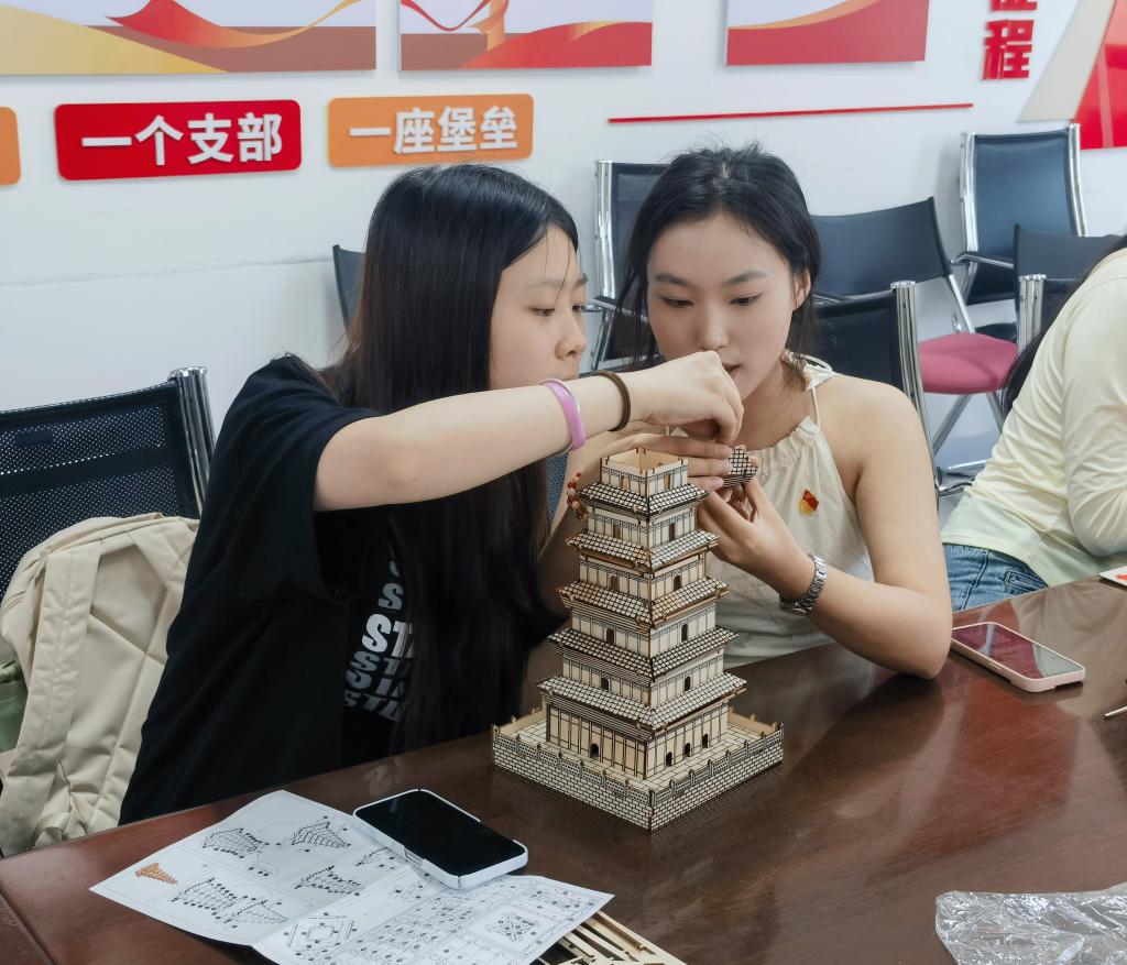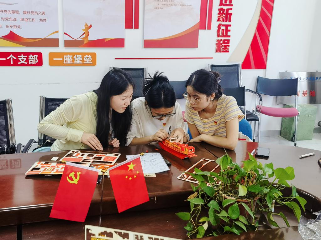 学生第二党支部开展手工制作活动。同学们利用发放的材料,手工拼接在中国共产党发展历史中有代表性的红船、天安门等模型。“红船”是中国共产党的“母亲船”。“红船精神”是教育当代中国共产党人的无价瑰宝,是用以提高党的执政能力,始终保持党的先进性的宝贵资源和精神财富。支部书记侯澄向与会人员讲解中国共产党成立和一大召开的情况,勉励同志们时刻不忘初心,牢记使命。