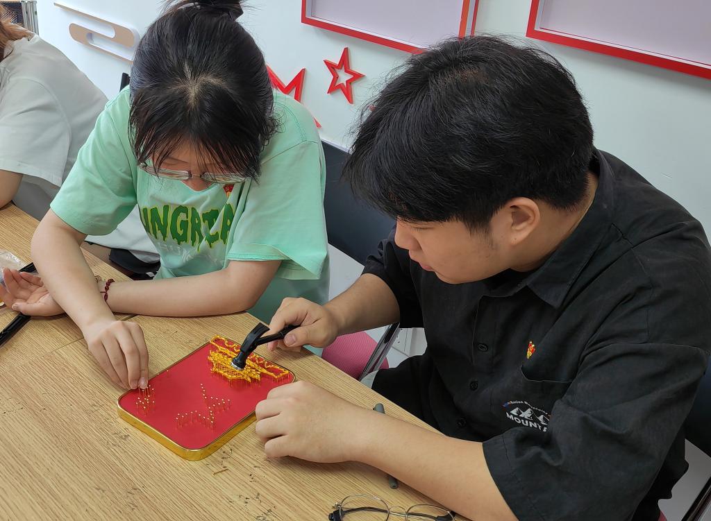 学生共同制作了钉子绕线画。在钉钉子、打绳结、绕丝线的过程中一步步探索,一点点感悟,最终呈现出中国地图、天安门、党徽、五角星等图案。党员们纷纷表示:要在学习、工作等方面弘扬“钉钉子精神”,踏踏实实走好每一步,把人生的钉子钉实、钉牢,以勇于担当的精神和坚忍不拔的意志,为实现中华民族伟大复兴的中国梦不懈奋斗。
