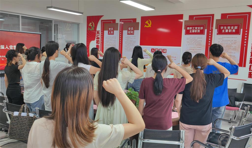 “我志愿加入中国共产党,拥护党的纲领,遵守党的章程……”,在支部书记梁爽、侯澄带领下,全体与会党员佩戴党员徽章,面向鲜红的党旗,高举右拳庄严宣誓。铿锵有力的誓言坚定了每位党员的初心和发扬党的优良传统的决心。